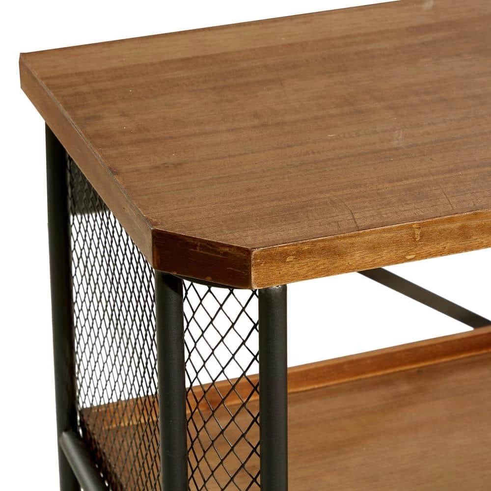 - This rectangular 3-tier shelving unit with overhang and beveled table top is made of robust wood and iron