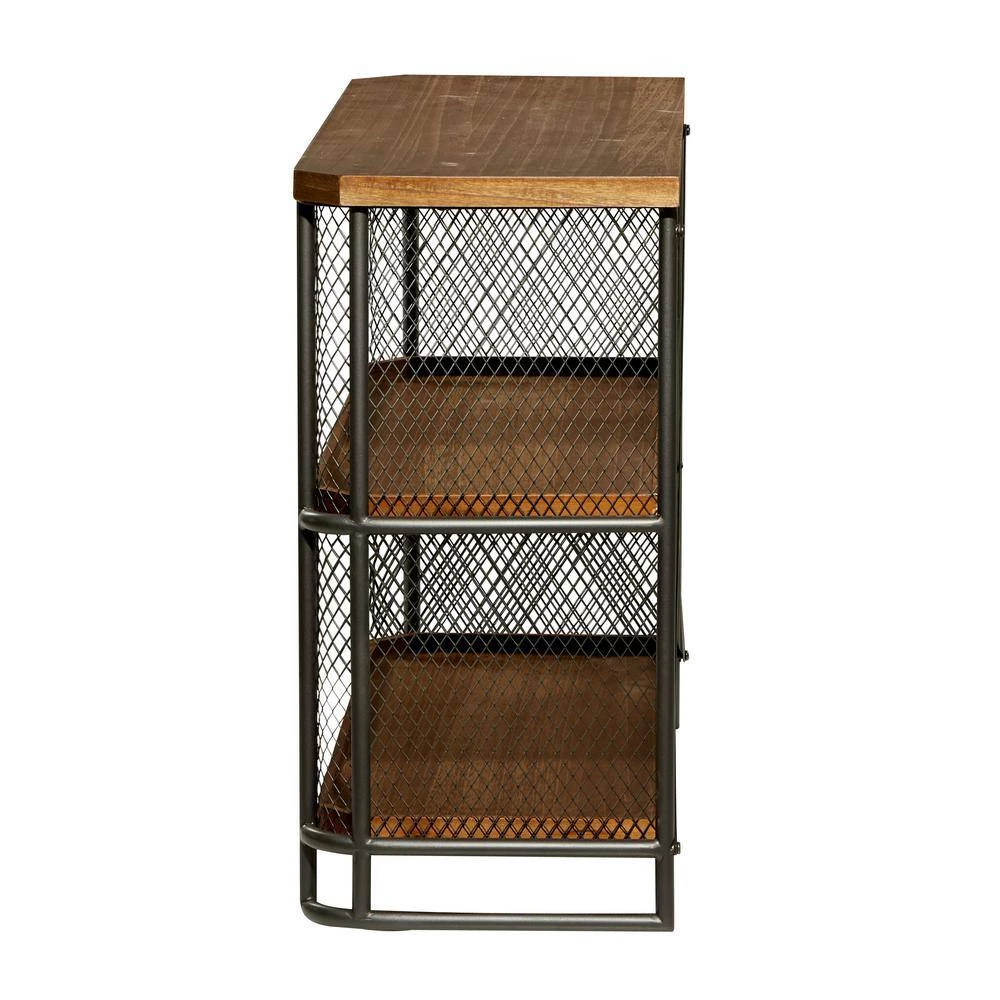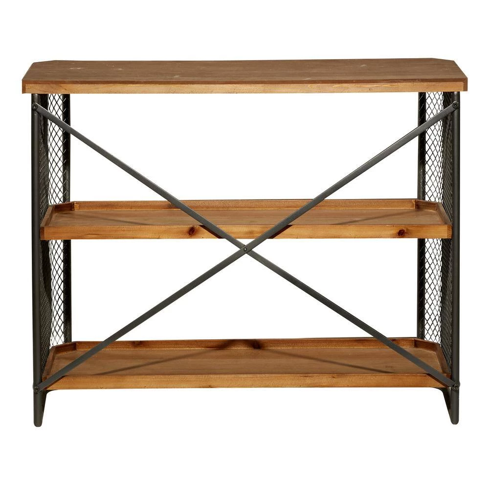 - This ideal furniture flaunts brown rectangular shelves with wood graining and metallic black crisscross-designed frames