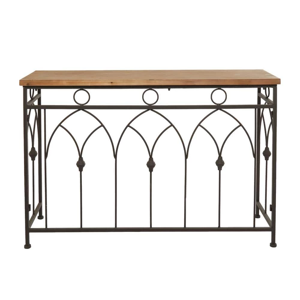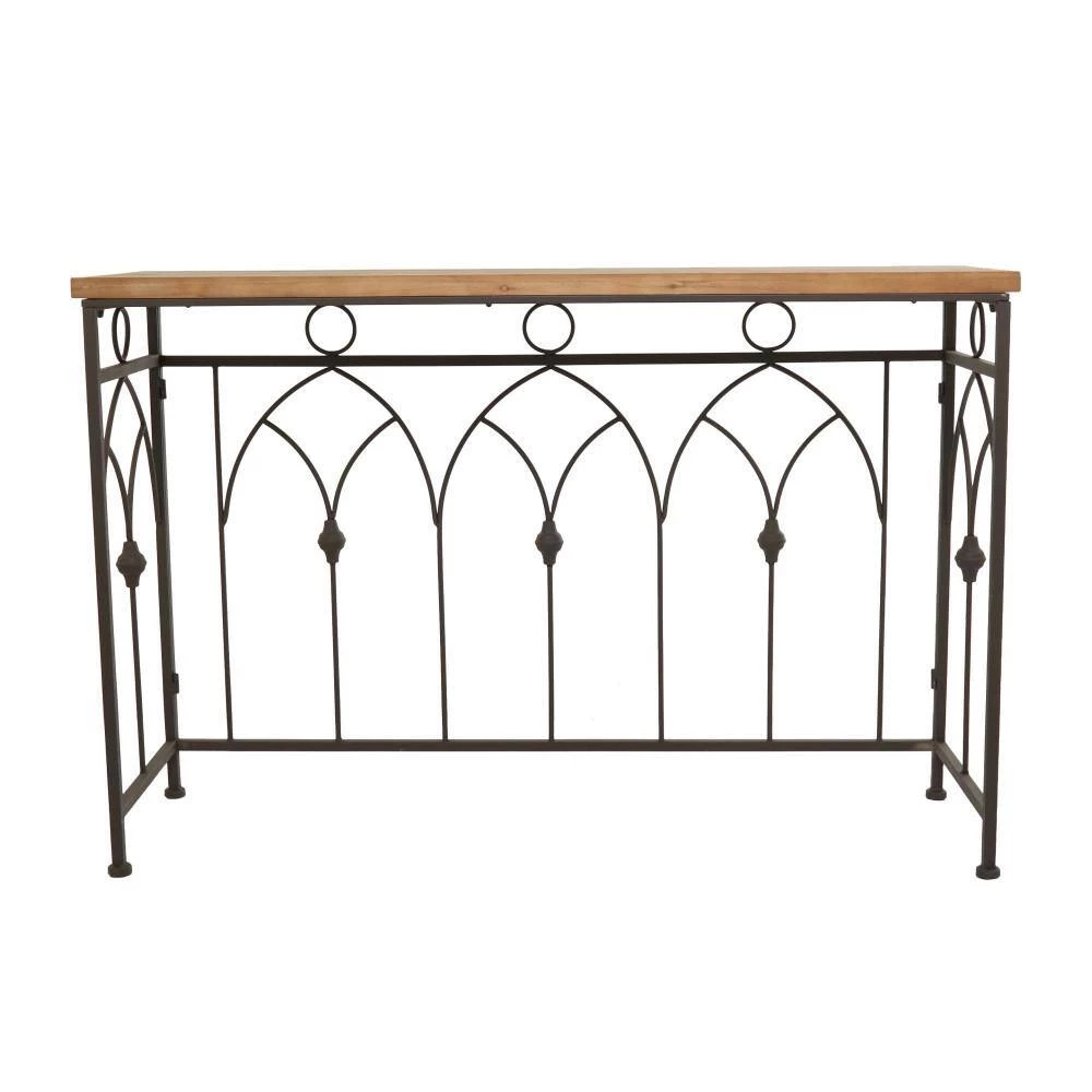 - Our show stopping farmhouse console table accentuates a rectangular brown wooden top with a black open metal frame designed with a geometric pattern and black rubber feet for extra safety