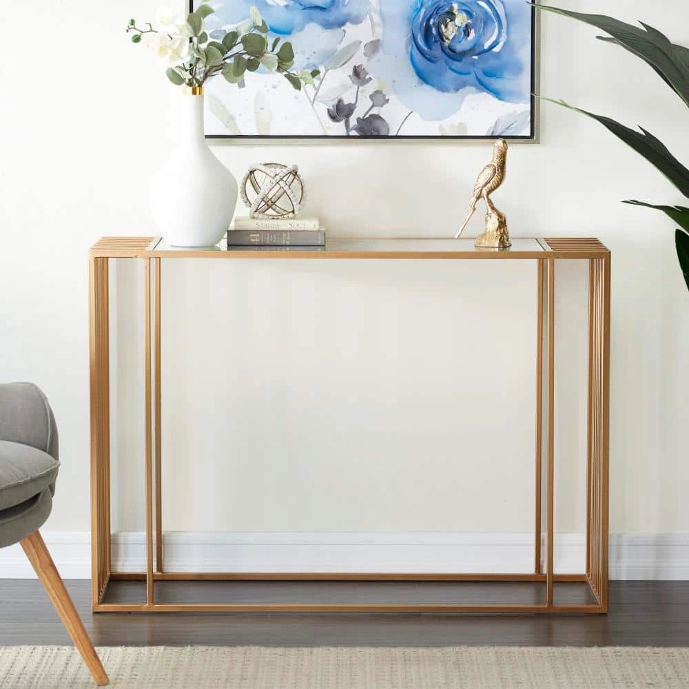 - This console table comes in a glamorous gold finish that provides a contemporary flair