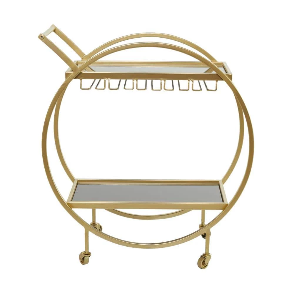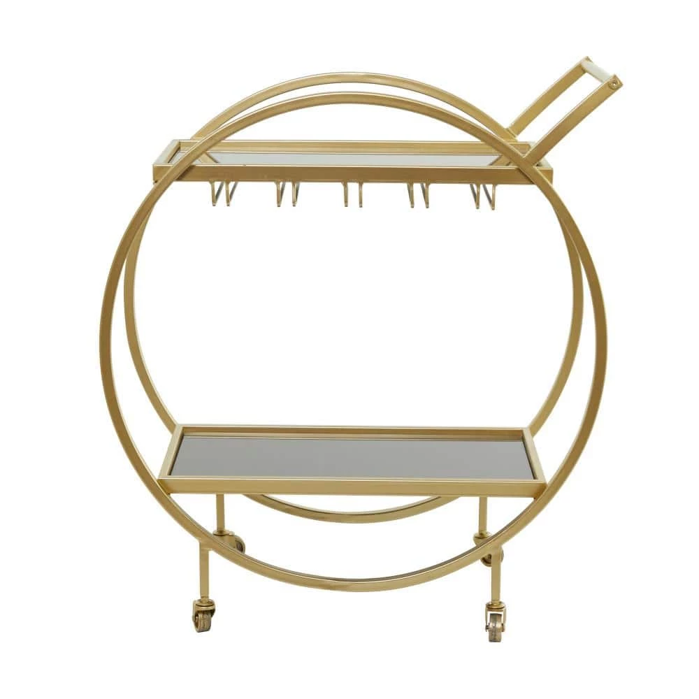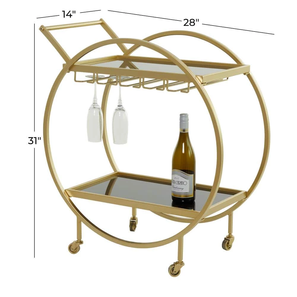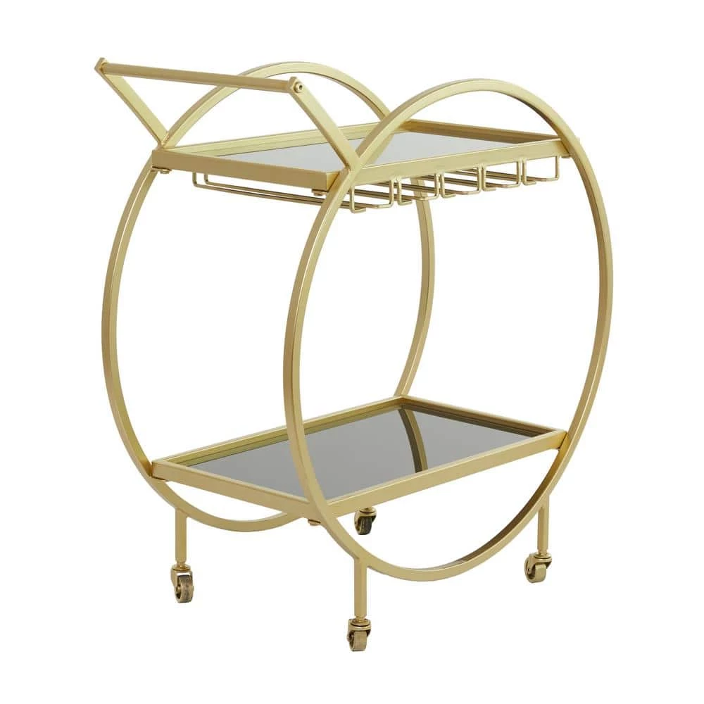 - Metallic gold finish complement the black tinted glass shelves of this bar cart
