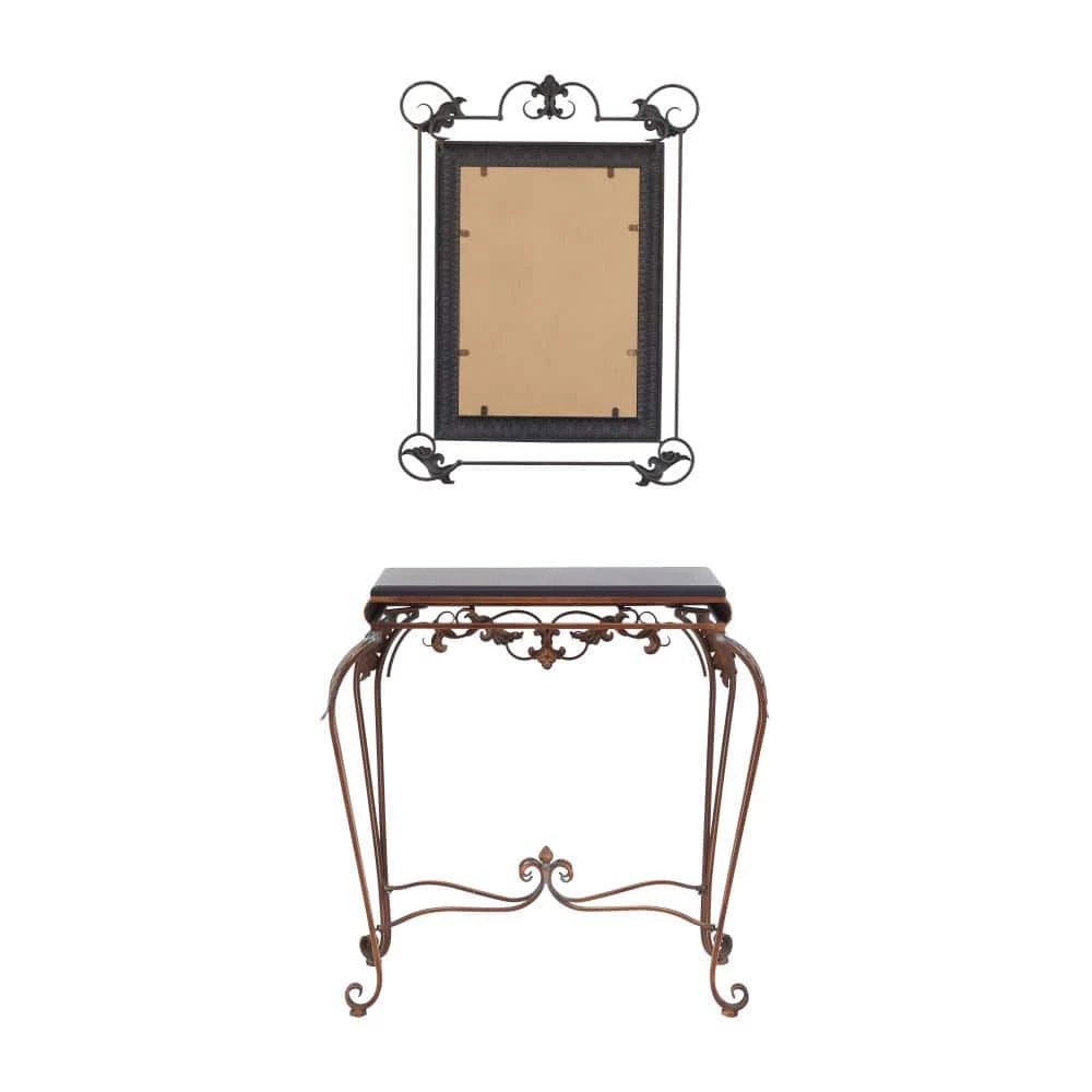 - Antique style table and mirror set features a polished and distressed bronze metal finish designed with a smooth black tabletop