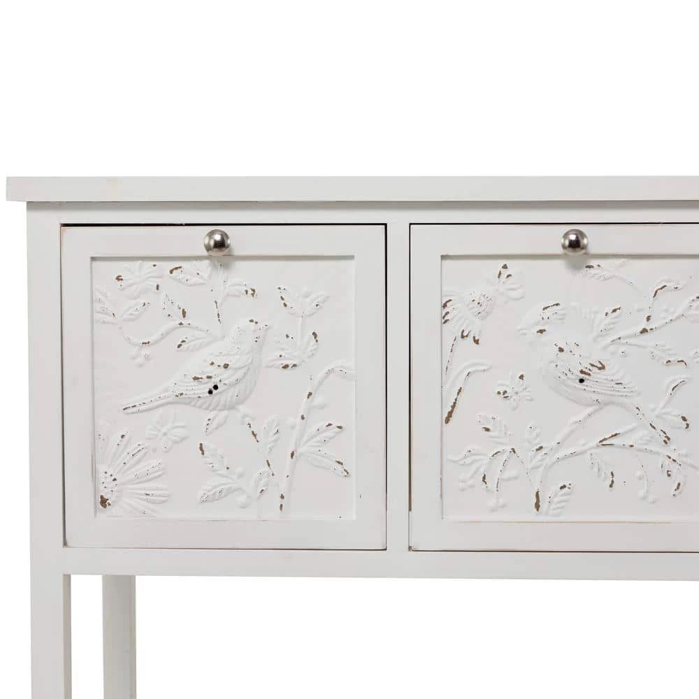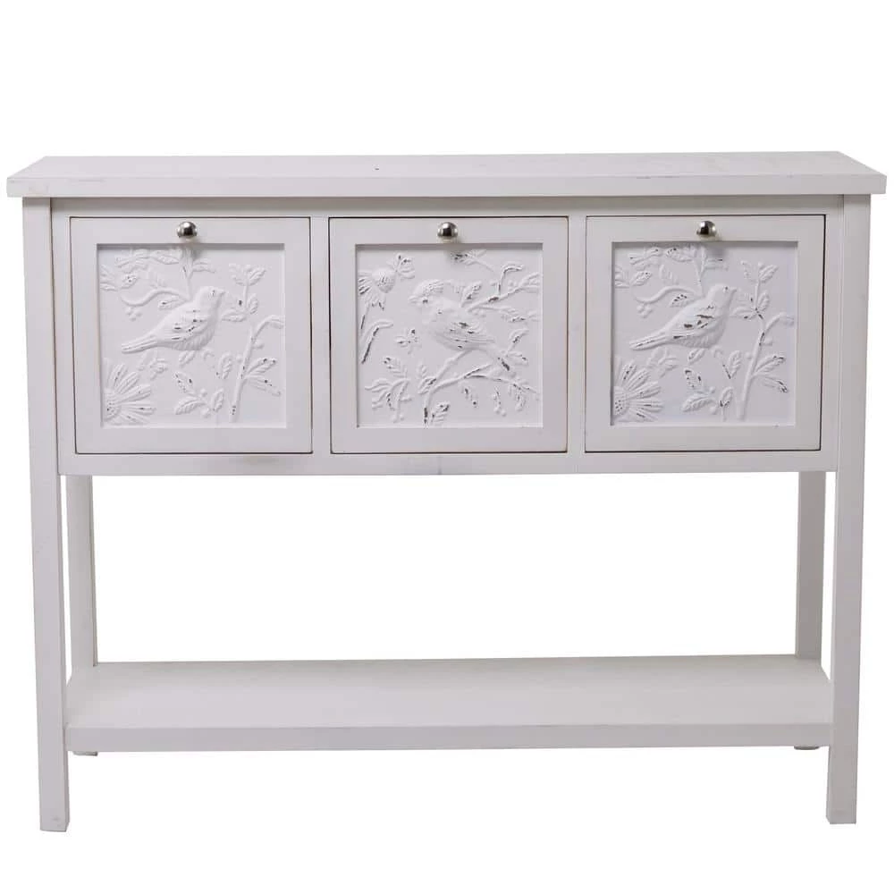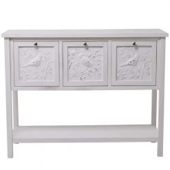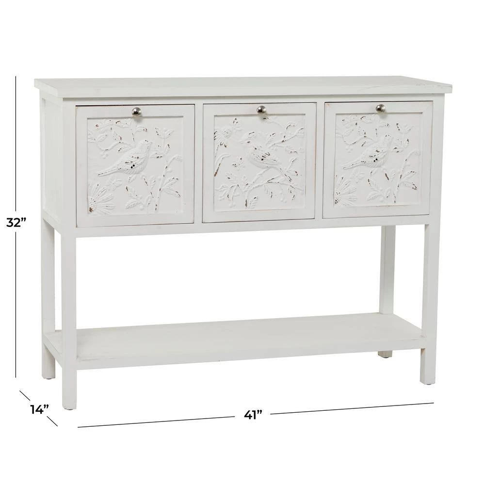 - Low relief perching bird carvings on each drawer with knob handles flaunt this console table with spacious drawers