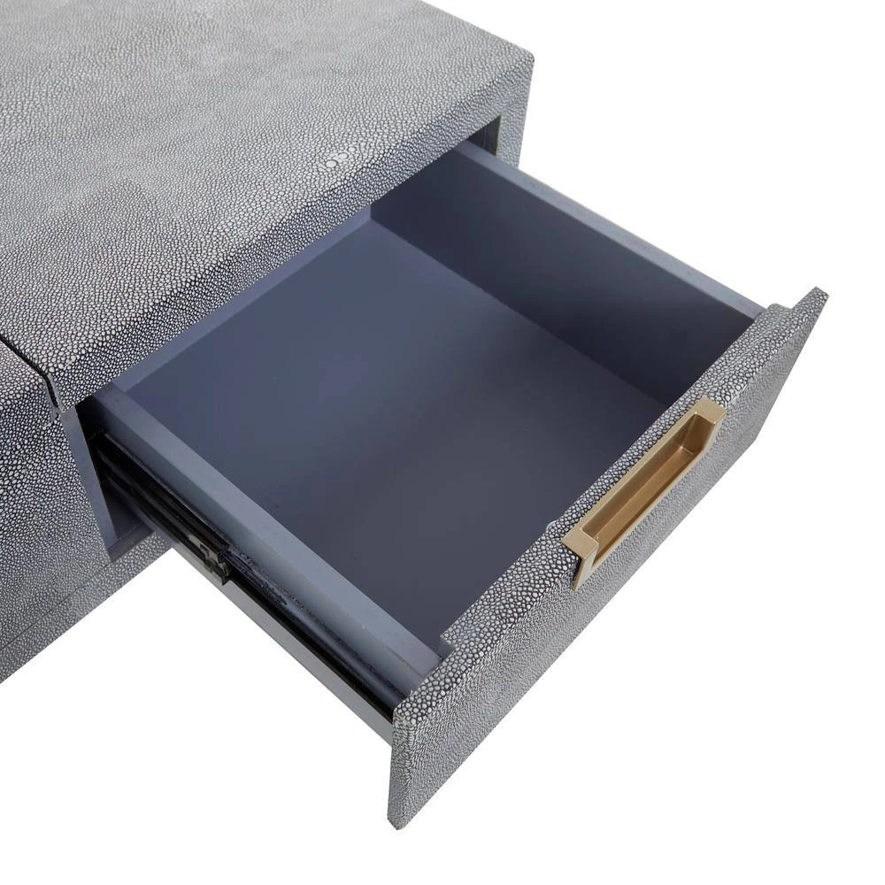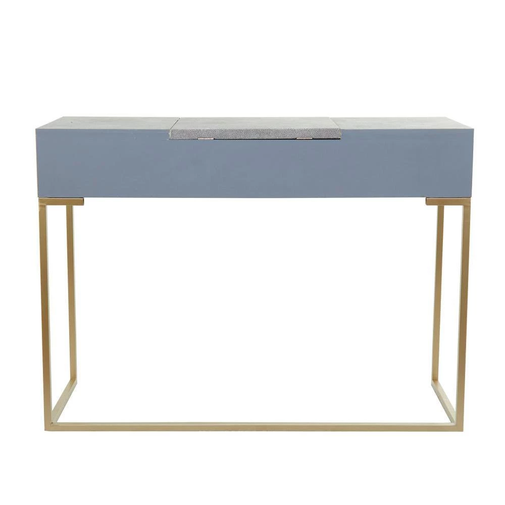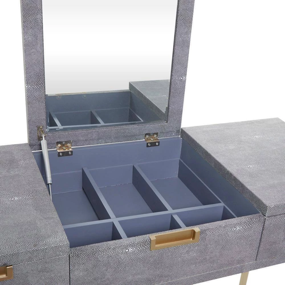 - Contemporary dressing table featuring a gray rectangular wooden vanity table designed with jewelry compartment, hinging top mirror, rectangular drawers with gold bar handles and a comfortable upholstered stool