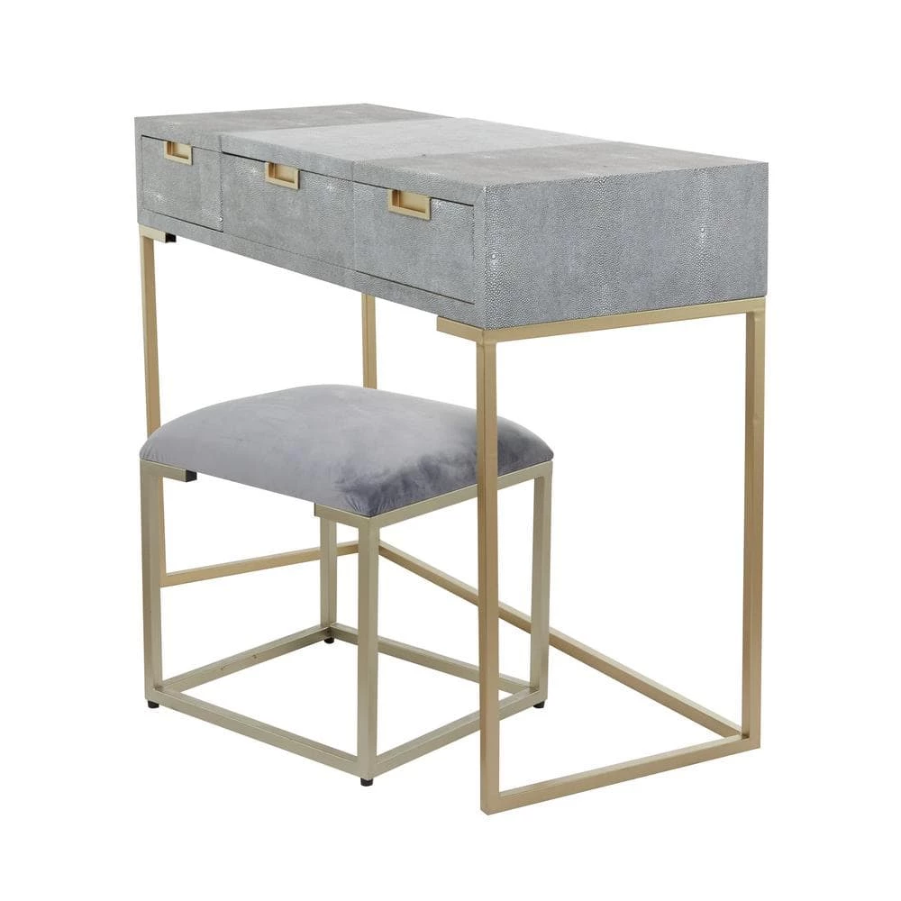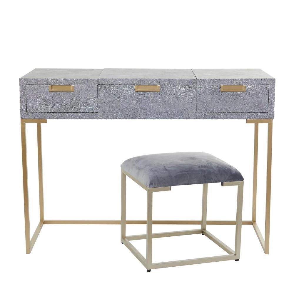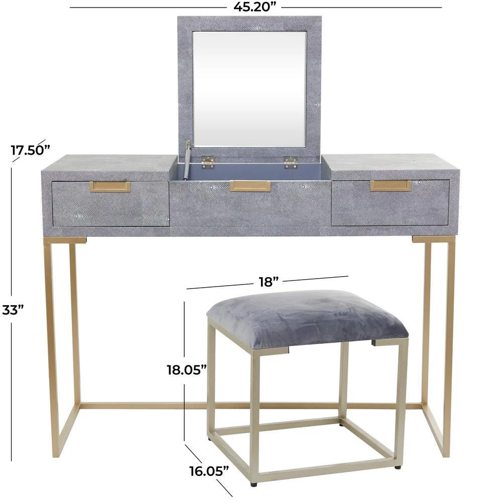 - A vanity table with mirror and chair featuring gray and gold finishes