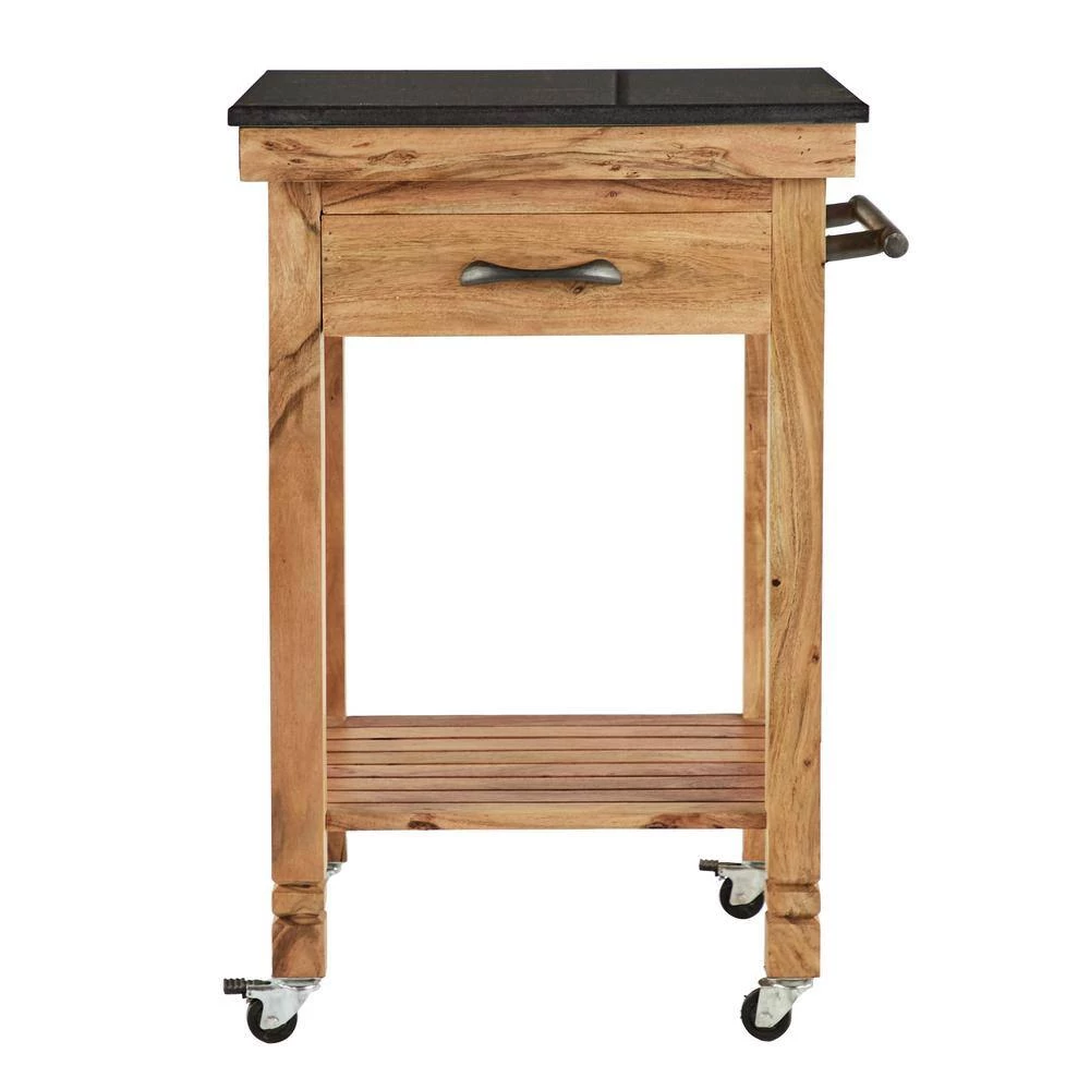 - This coastal style kitchen trolley features a square granite surface attached to four legs reinforced with a wooden slat shelf surface on 4 wheels