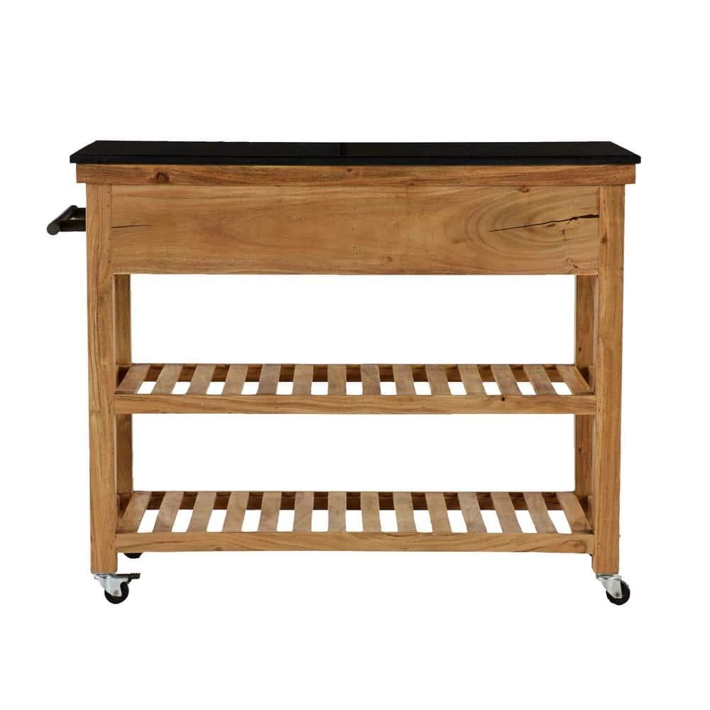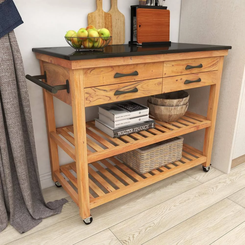 - This rolling kitchen cart with 4 wheels features stoneware tabletop that houses 4 pull-out drawers, 2 tiers of wine bottle racks and a metal T-bar handle for optimal transport