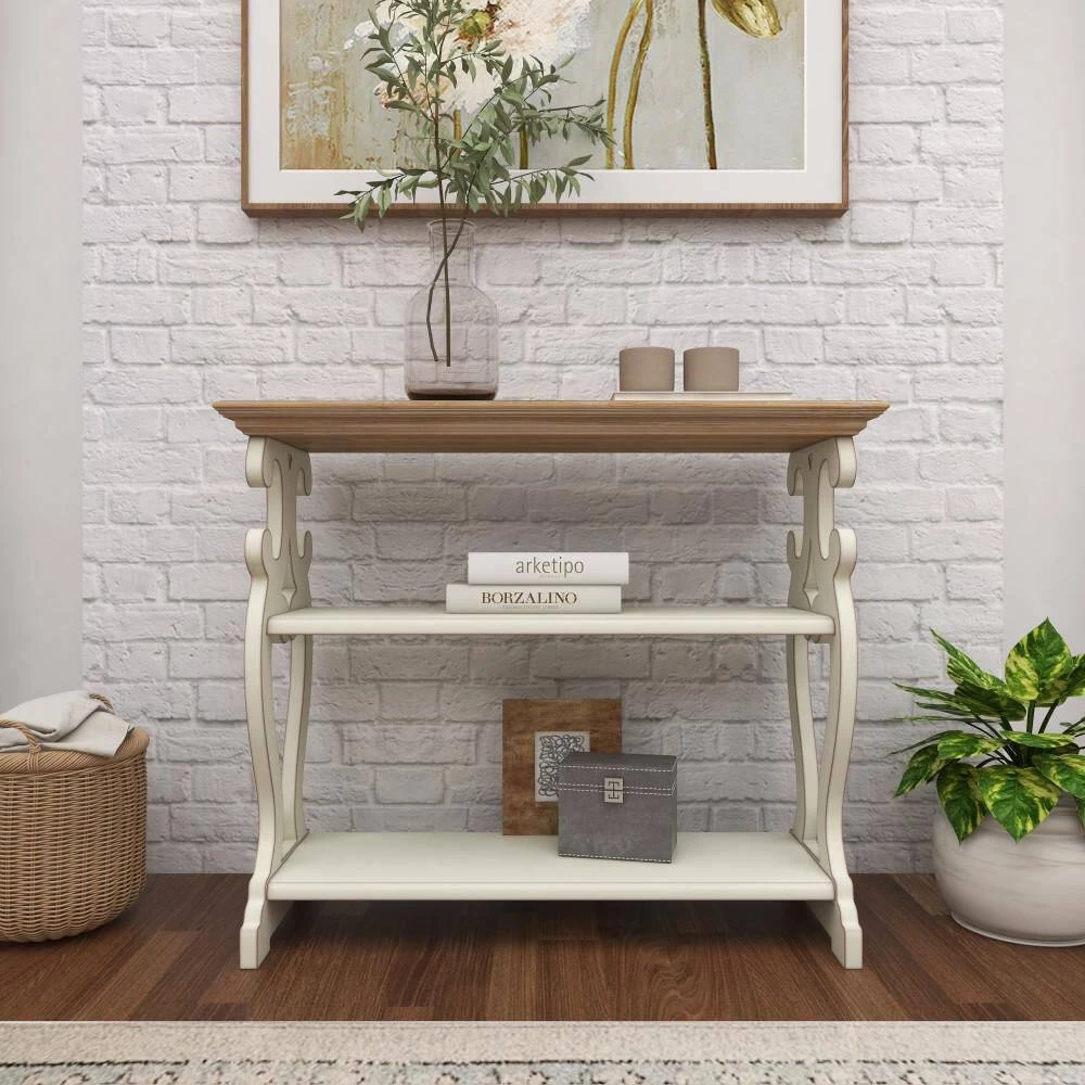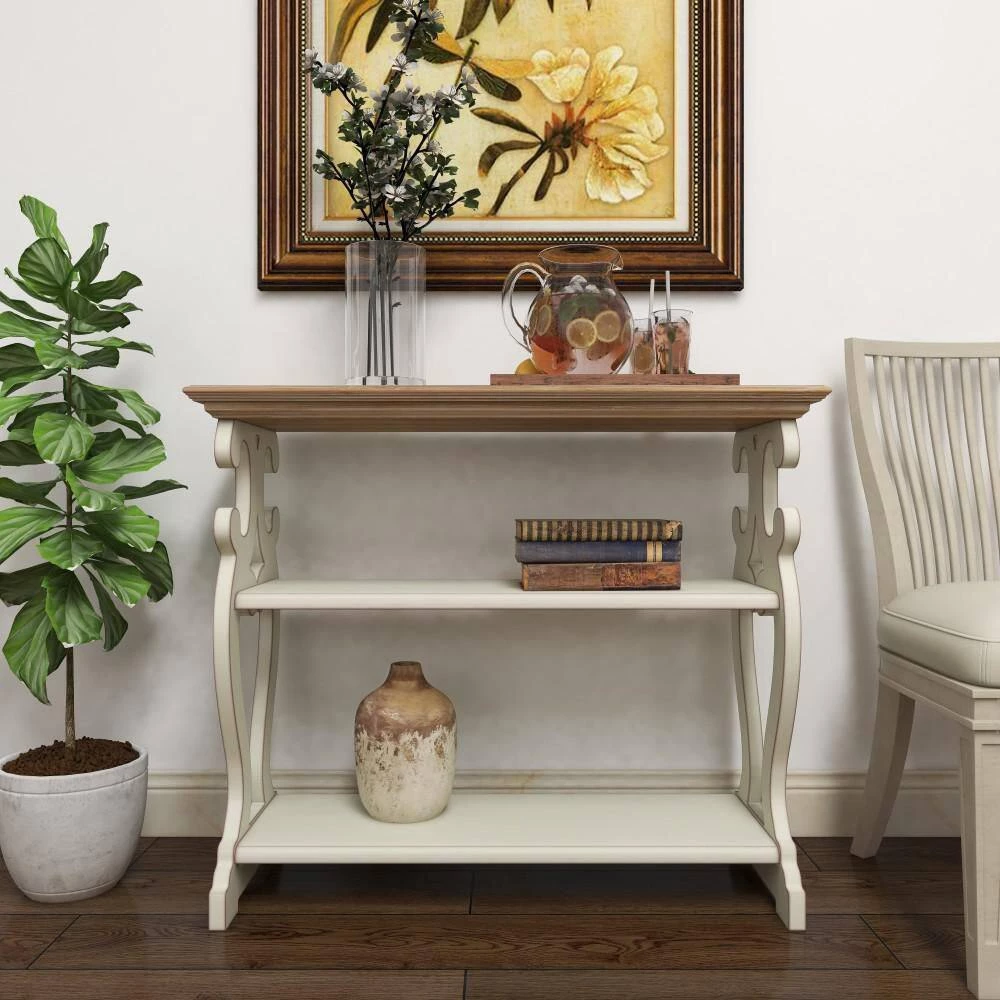 - Farmhouse console table features a two tiered design with ornate carving structure and fluted tapered top for a delicate touch