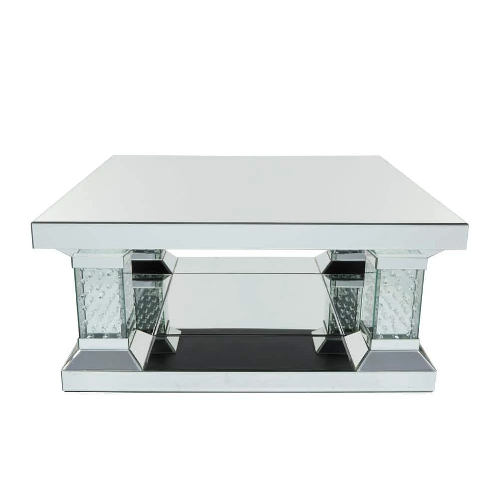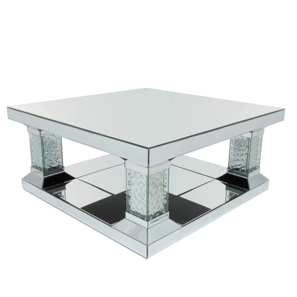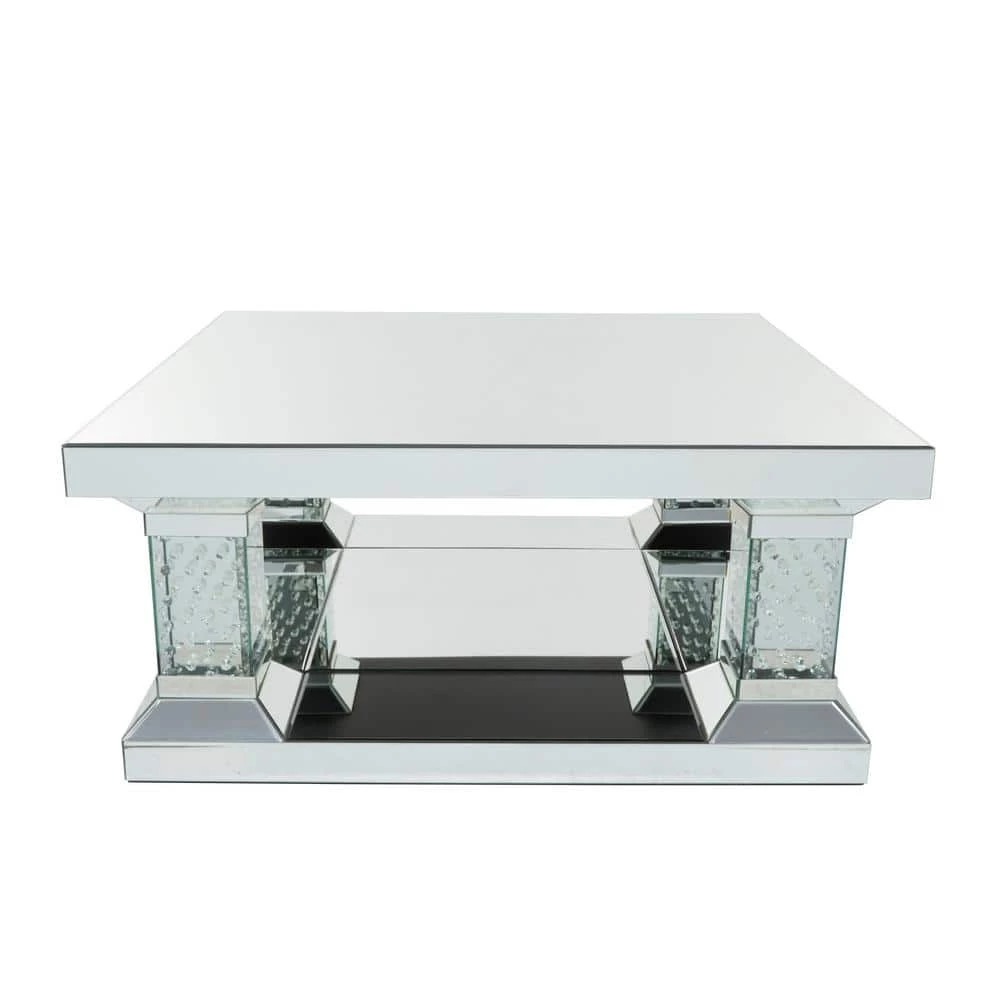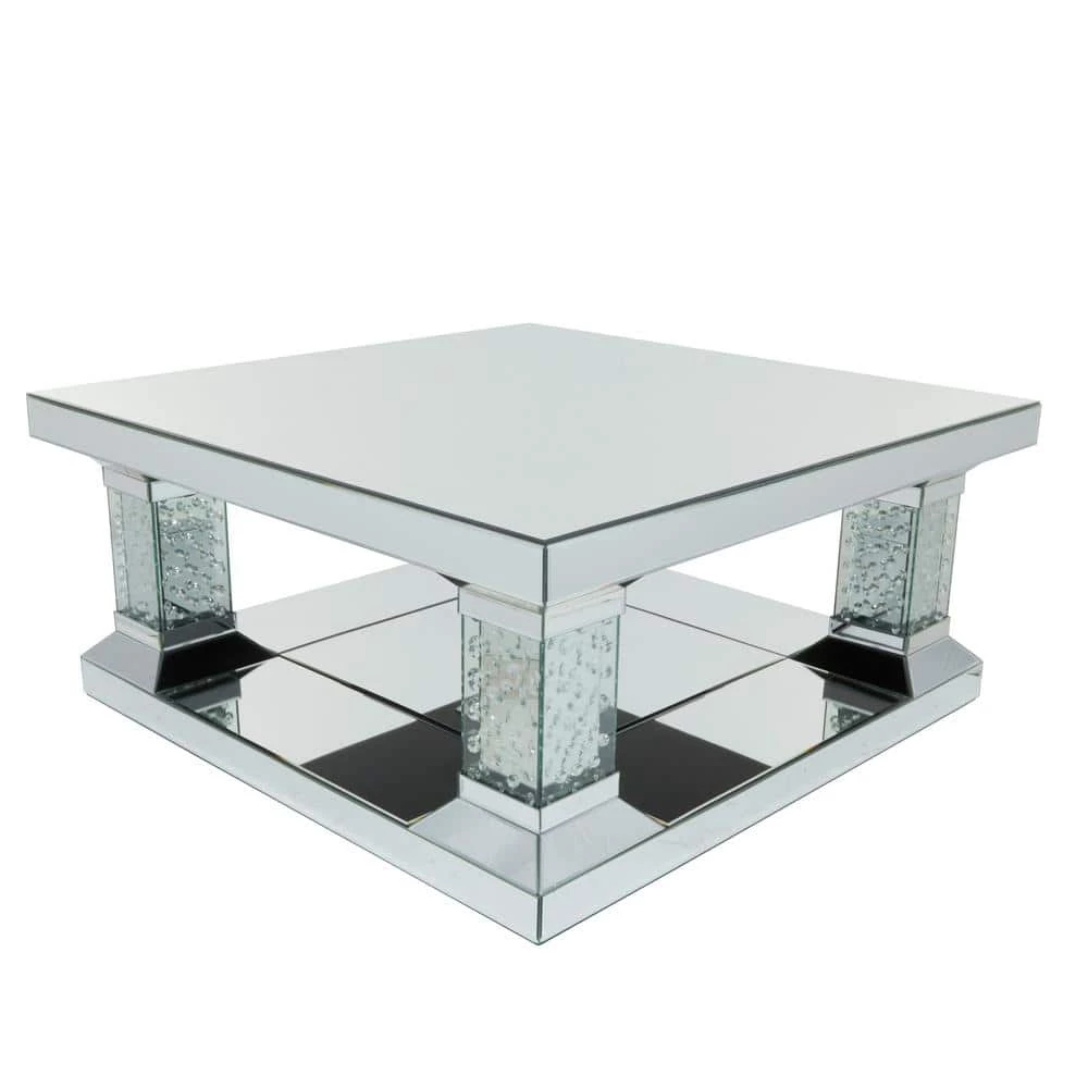 - A glam style coffee table showcasing silver finished reflective glass panels