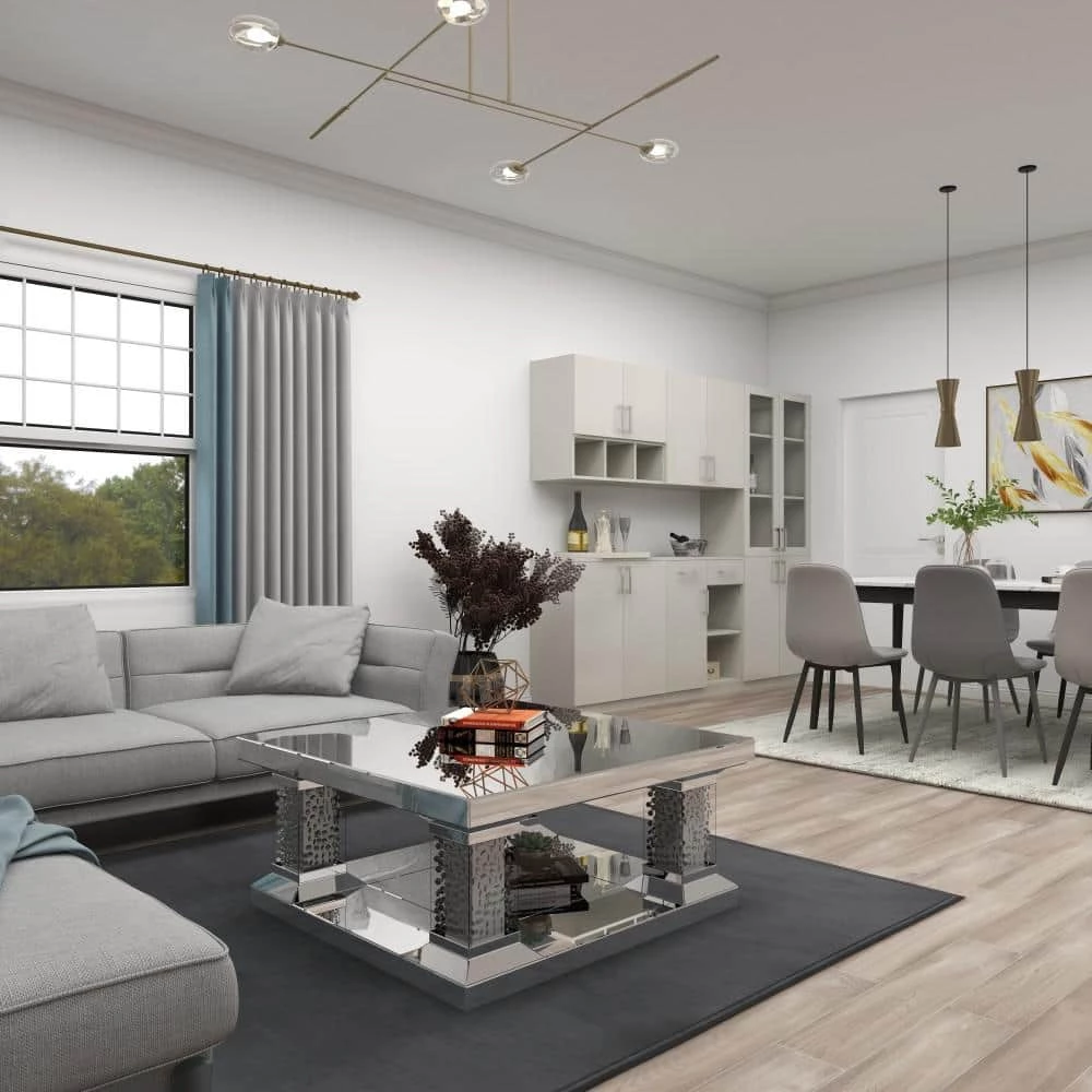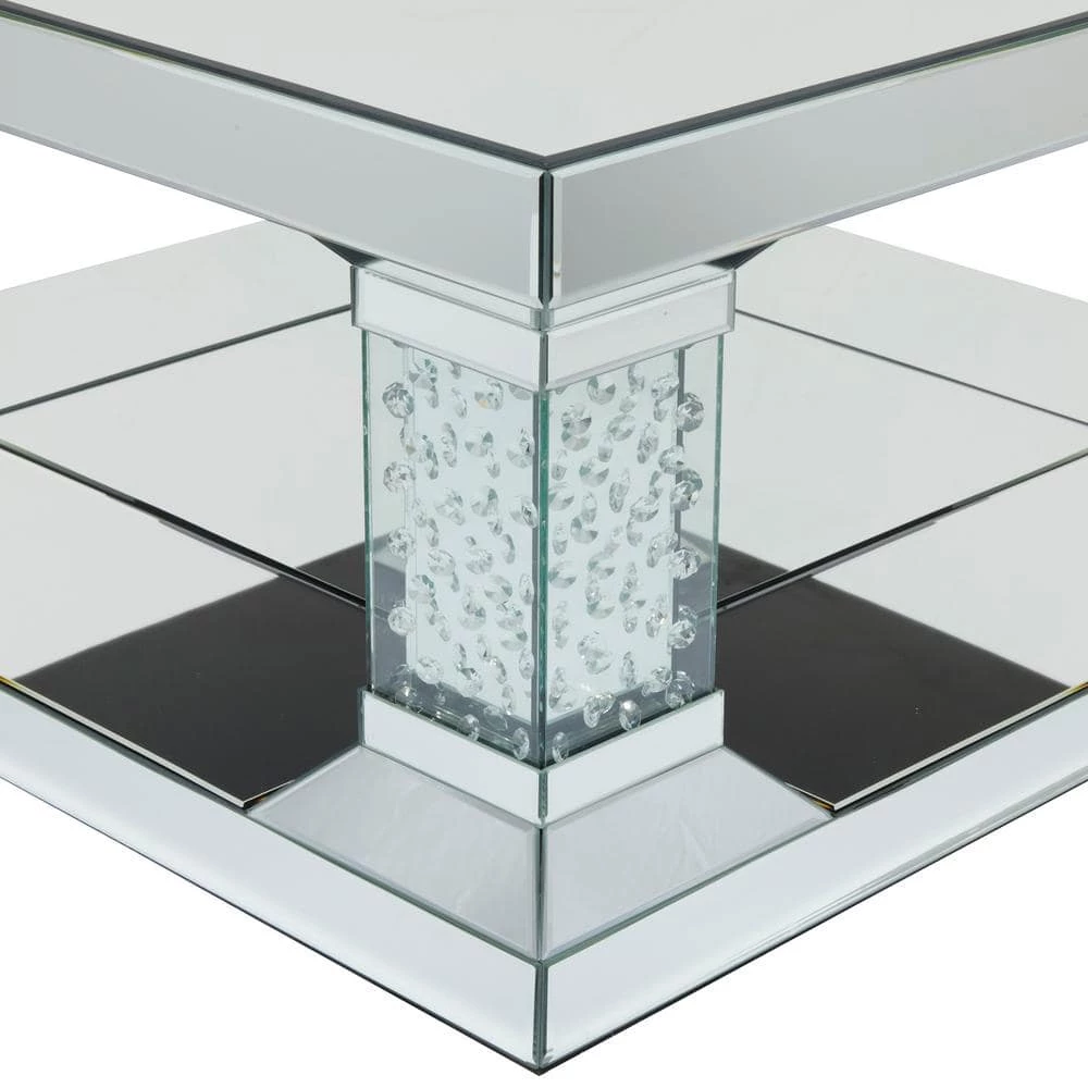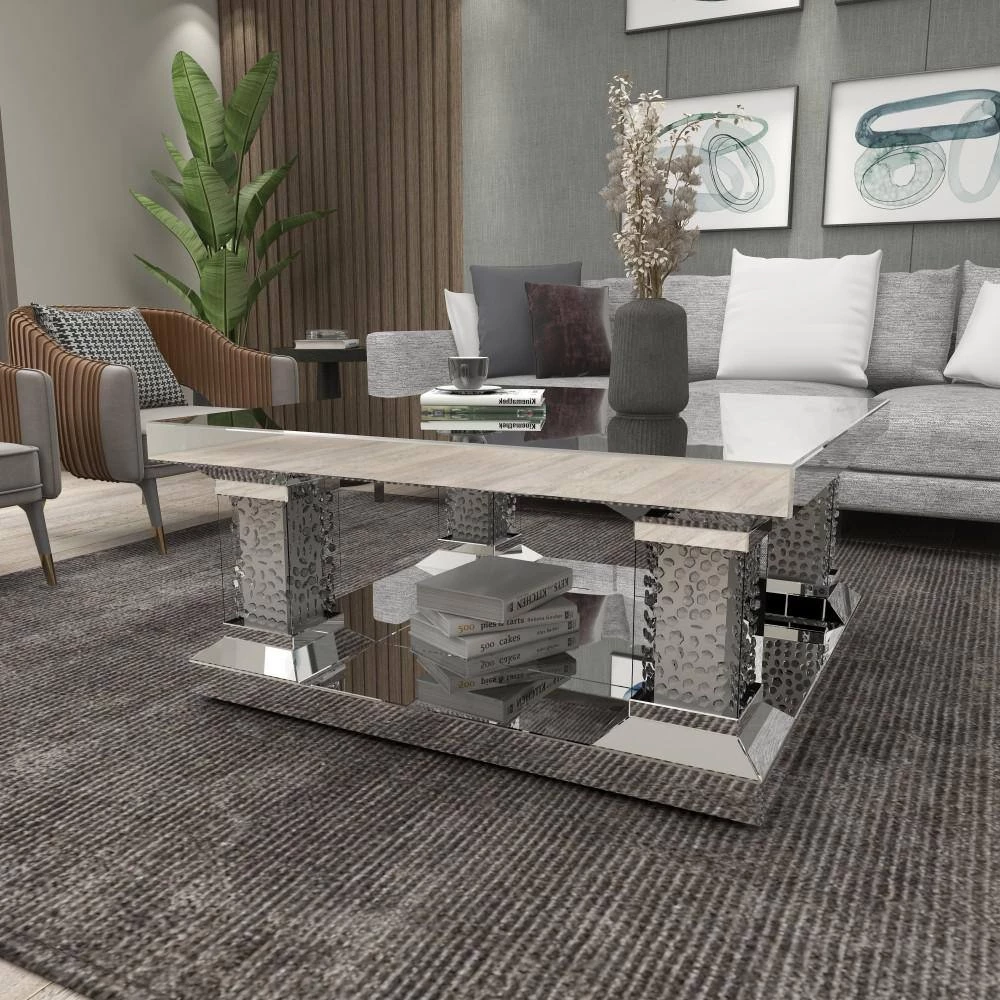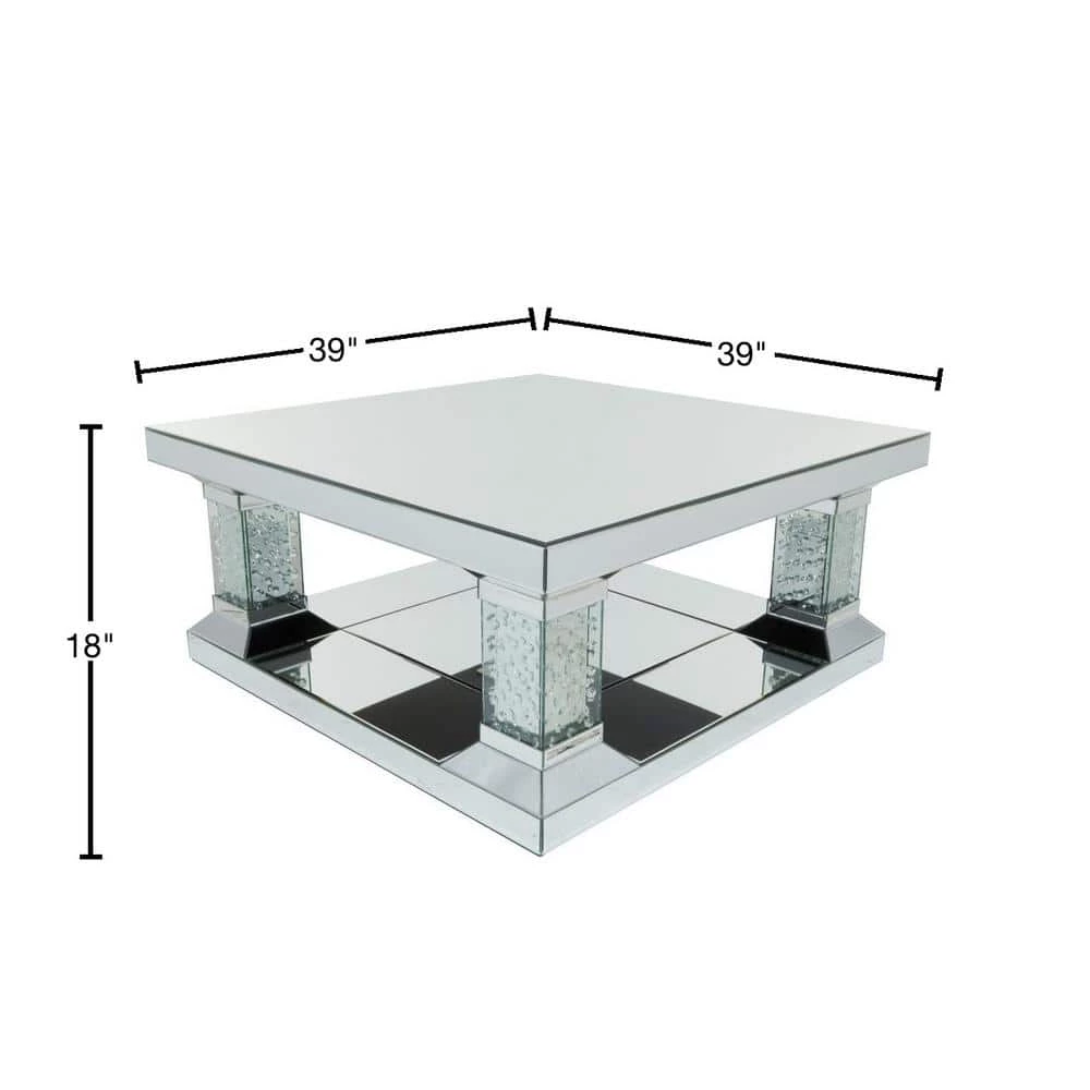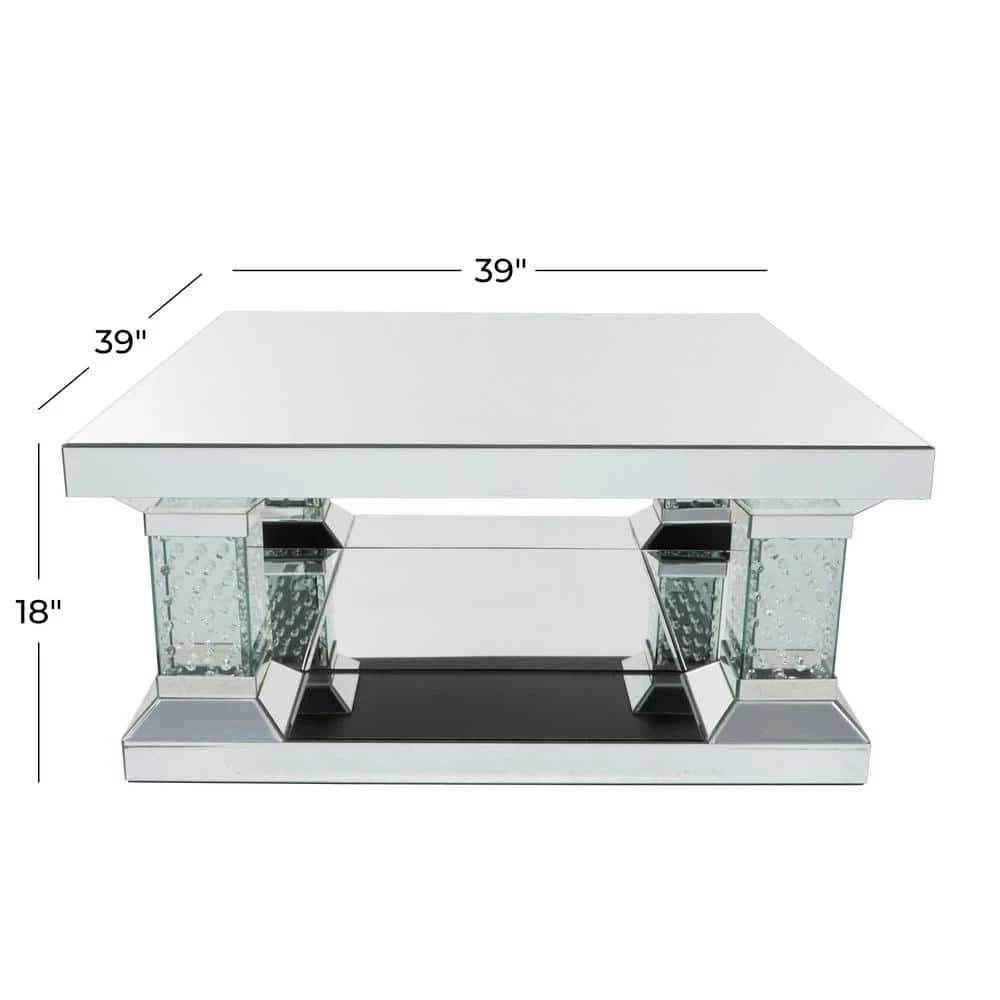 - A glam style coffee table showcasing silver finished reflective glass panels