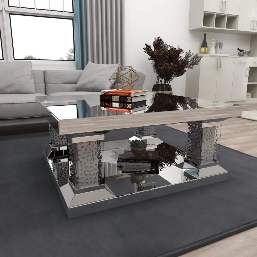 - This show stopping wood and glass coffee table accentuates a rectangular shape with sophisticated wood structure securely attached with reflective mirror panels and posts with inner crystal embellishments