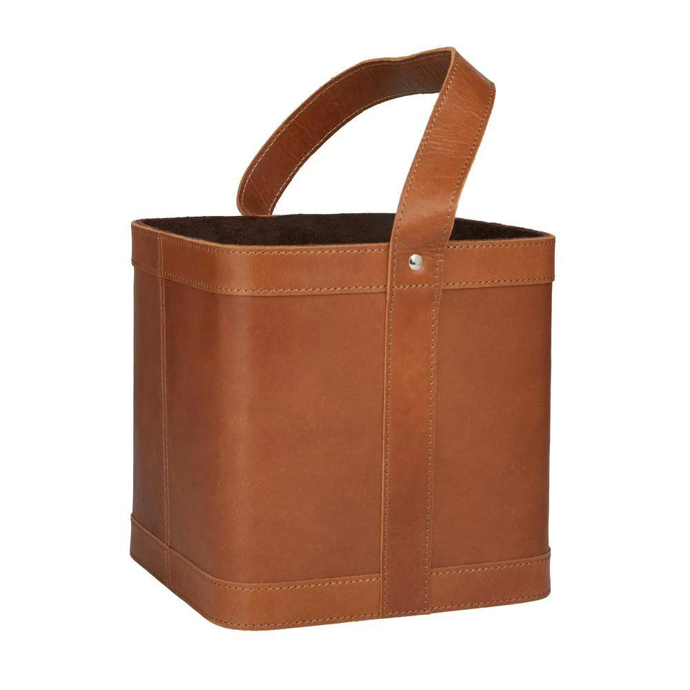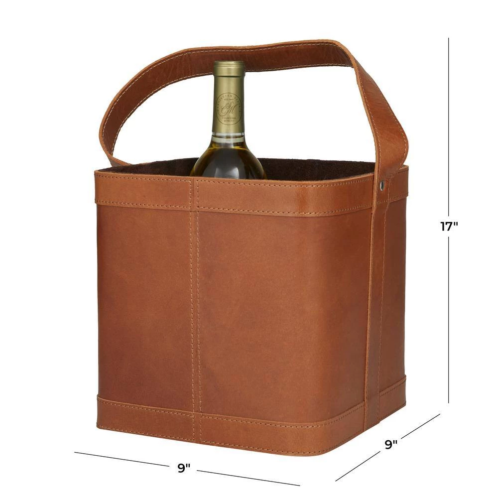 - A leather strap is securely sewn to the sides and interior bottle compartments offers easy carry