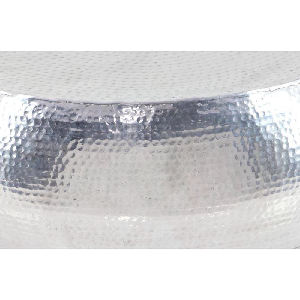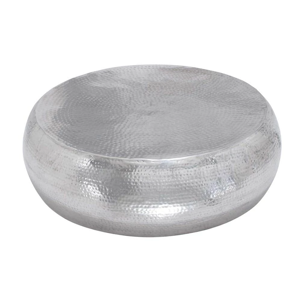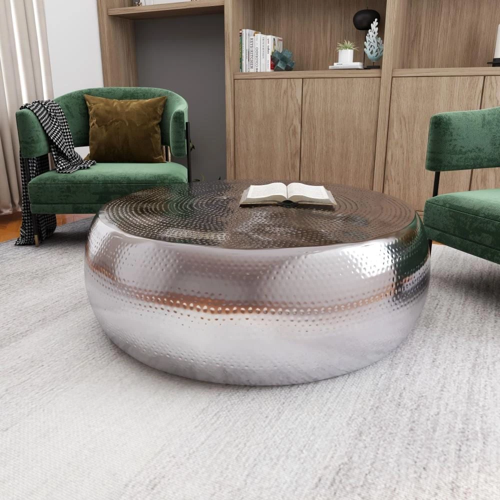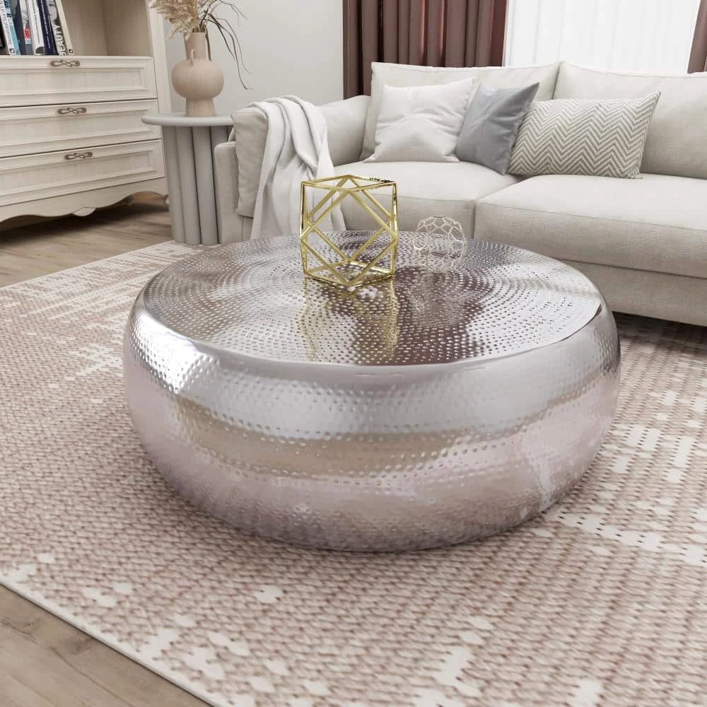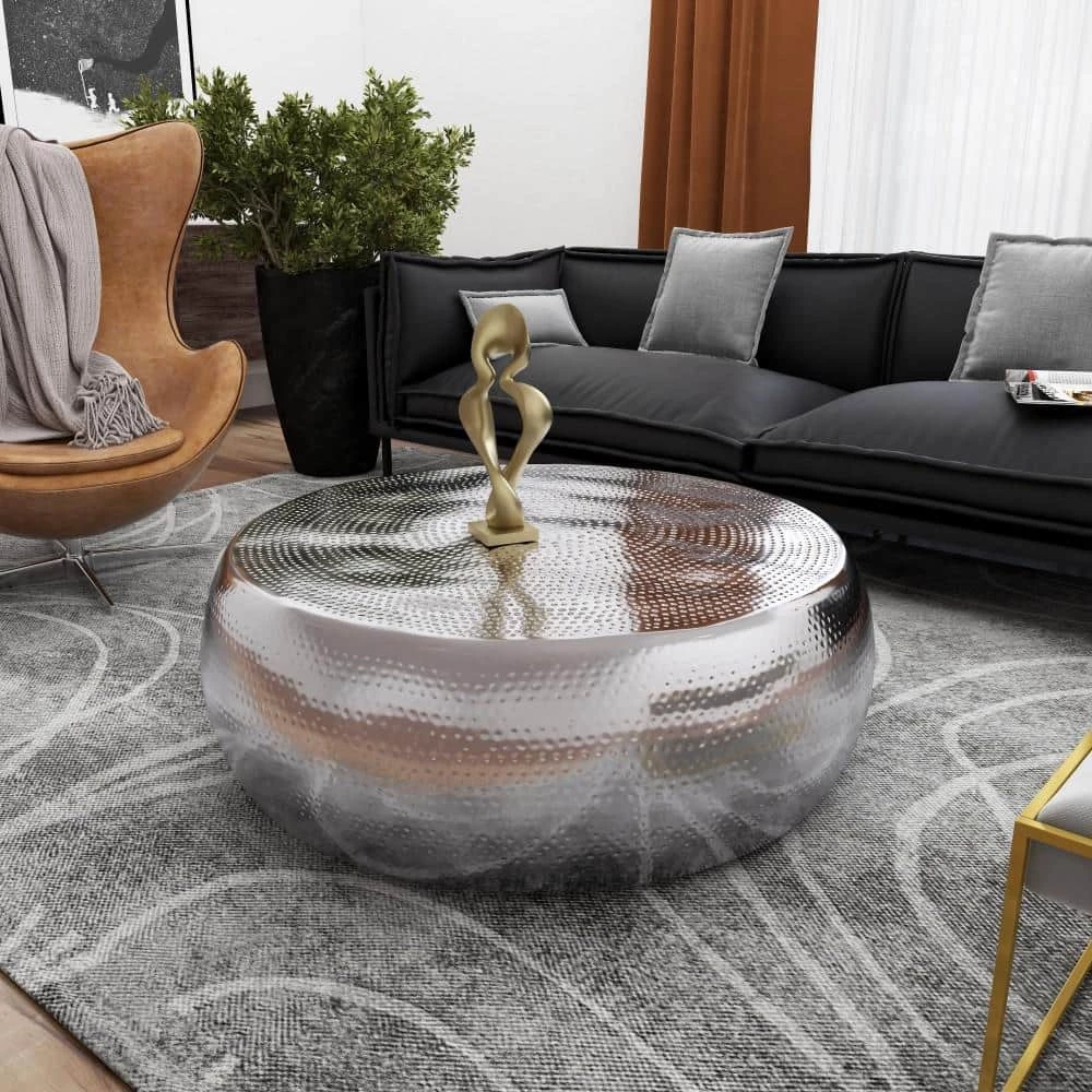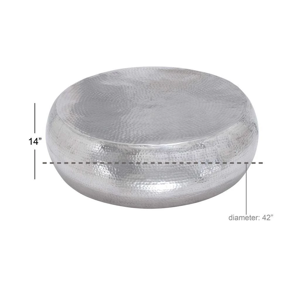 - This coffee table features a drum shape structure with a rounded form and hammered textured design that slightly concave at the center for a secure display