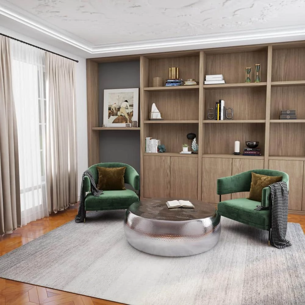 A spacious table top with a unique design offers an eye catching display from every angle. Useful and elegant, coffee tables are more than just a pretty piece of furniture in front of your couch. Round silver coffee table are best displayed together in the living room with books, potted plants and decorative metal object for an edgy appeal. This item ships in 1 carton. Suitable for indoor use only. Maximum weight limit is 75 lbs. Made in India. Contemporary design.