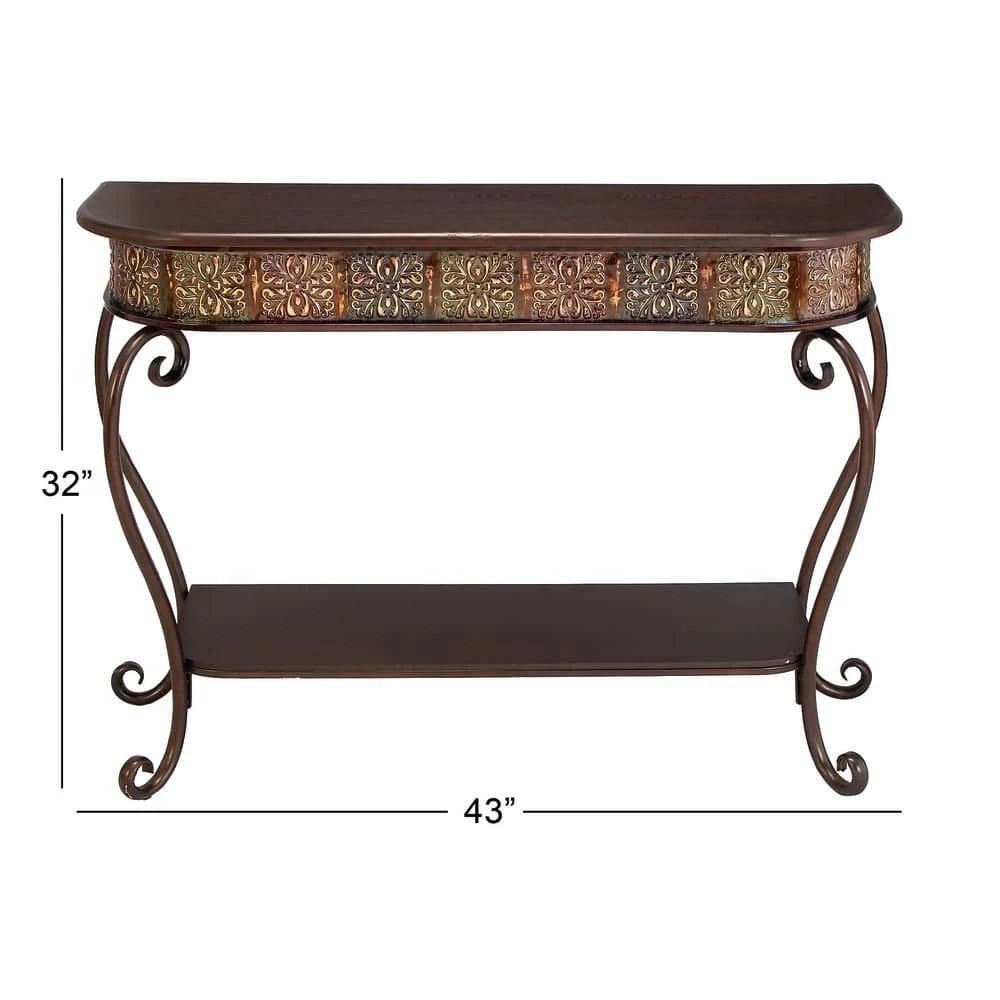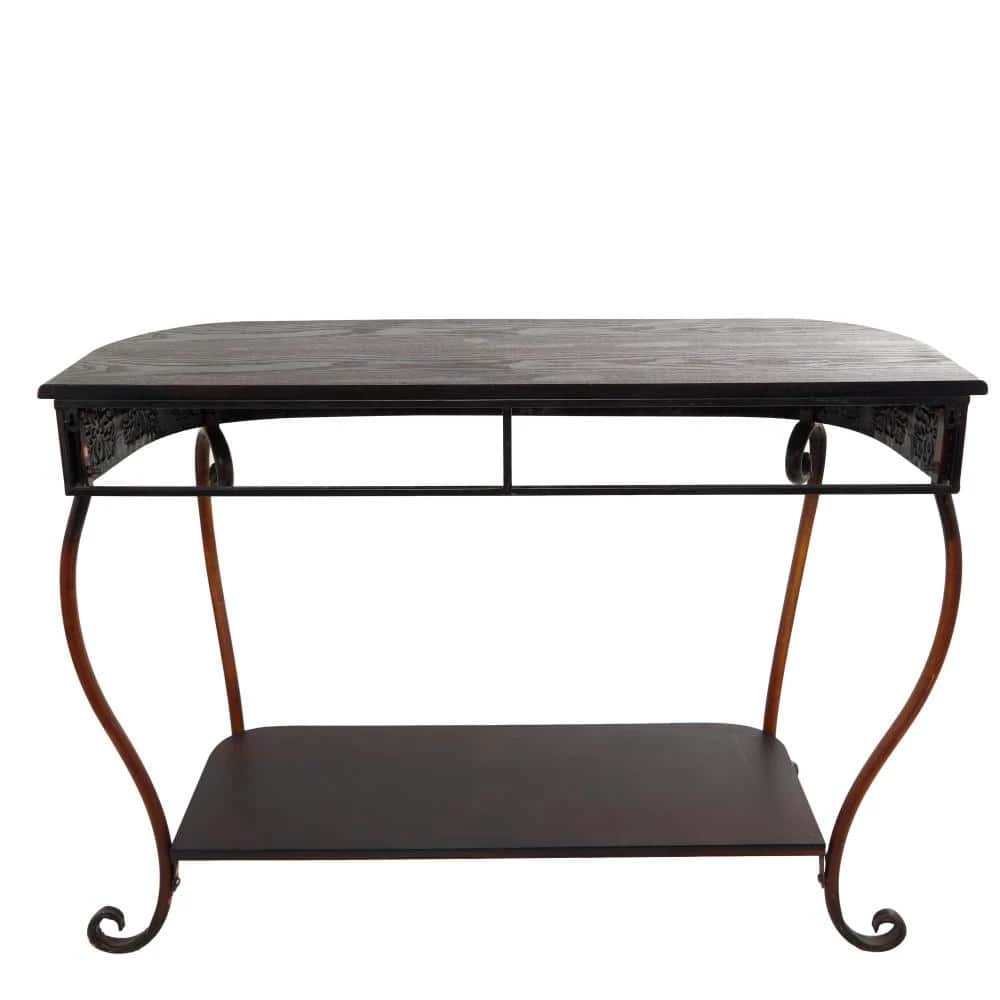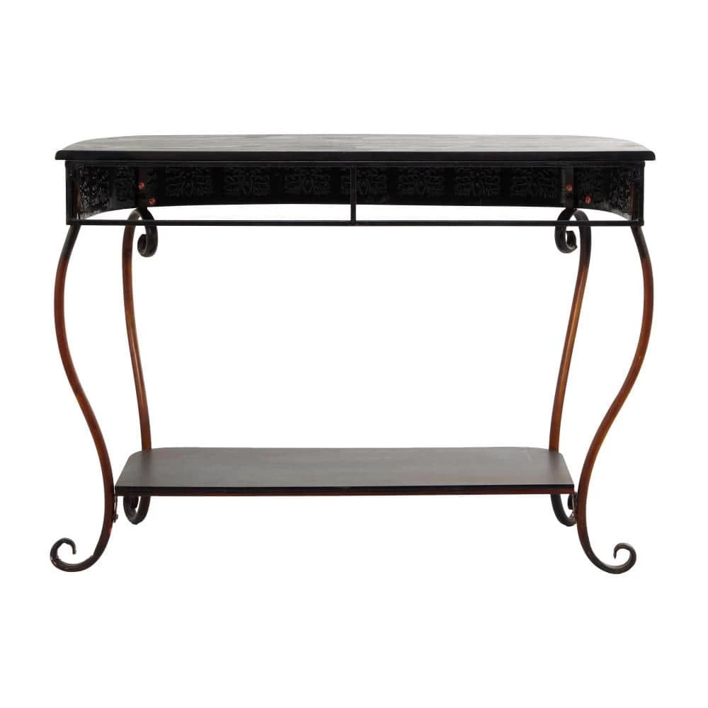- Ornate console table is crafted from a marriage of solid iron and wood