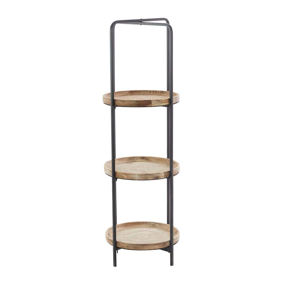 - The natural wood brown finish of this ladder shelf is highlighted with an ebony black frame