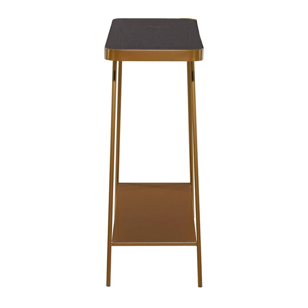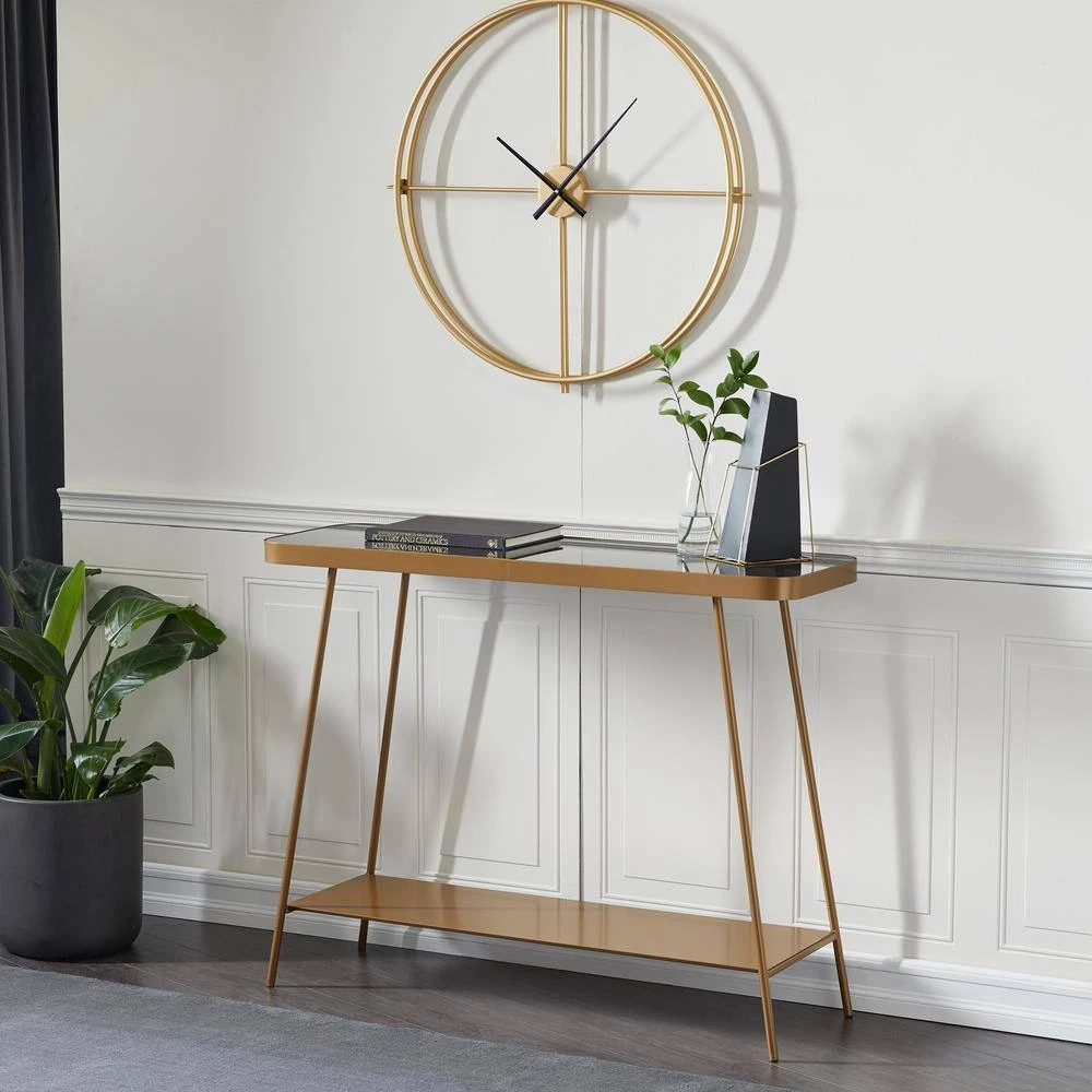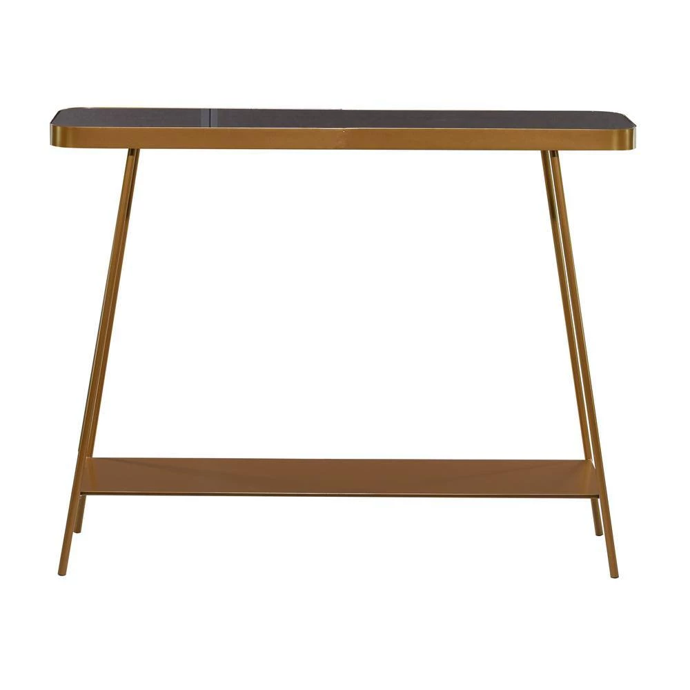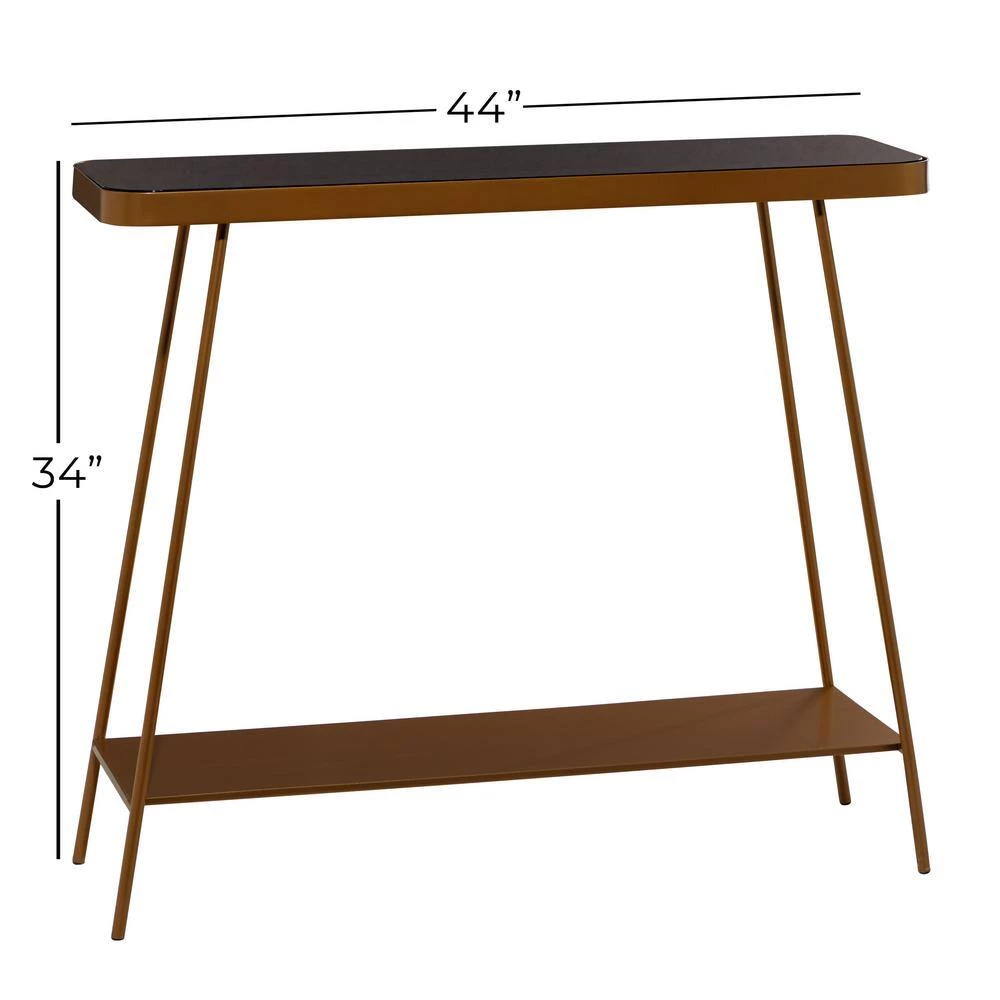- This extravagant gold glass console table features a transparent black glass finish and a polished gold iron finish