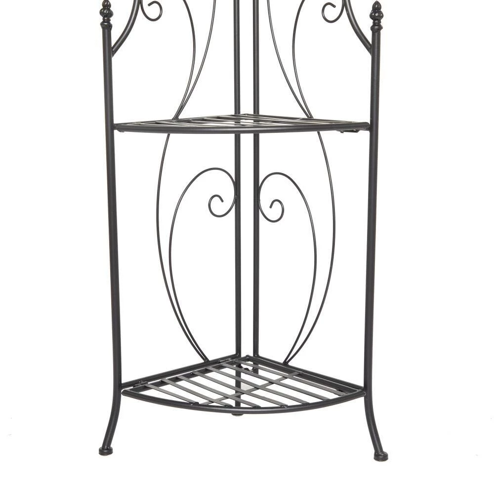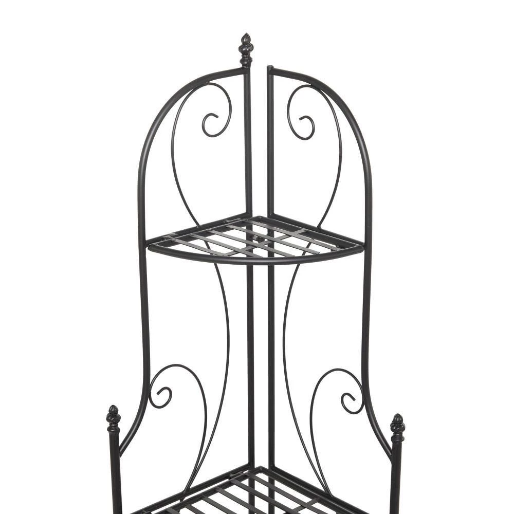 - This tall bakers rack for plants showcases a 3-tier corner shelf unit with a triangular woven iron base and a swirly scroll accent body design
