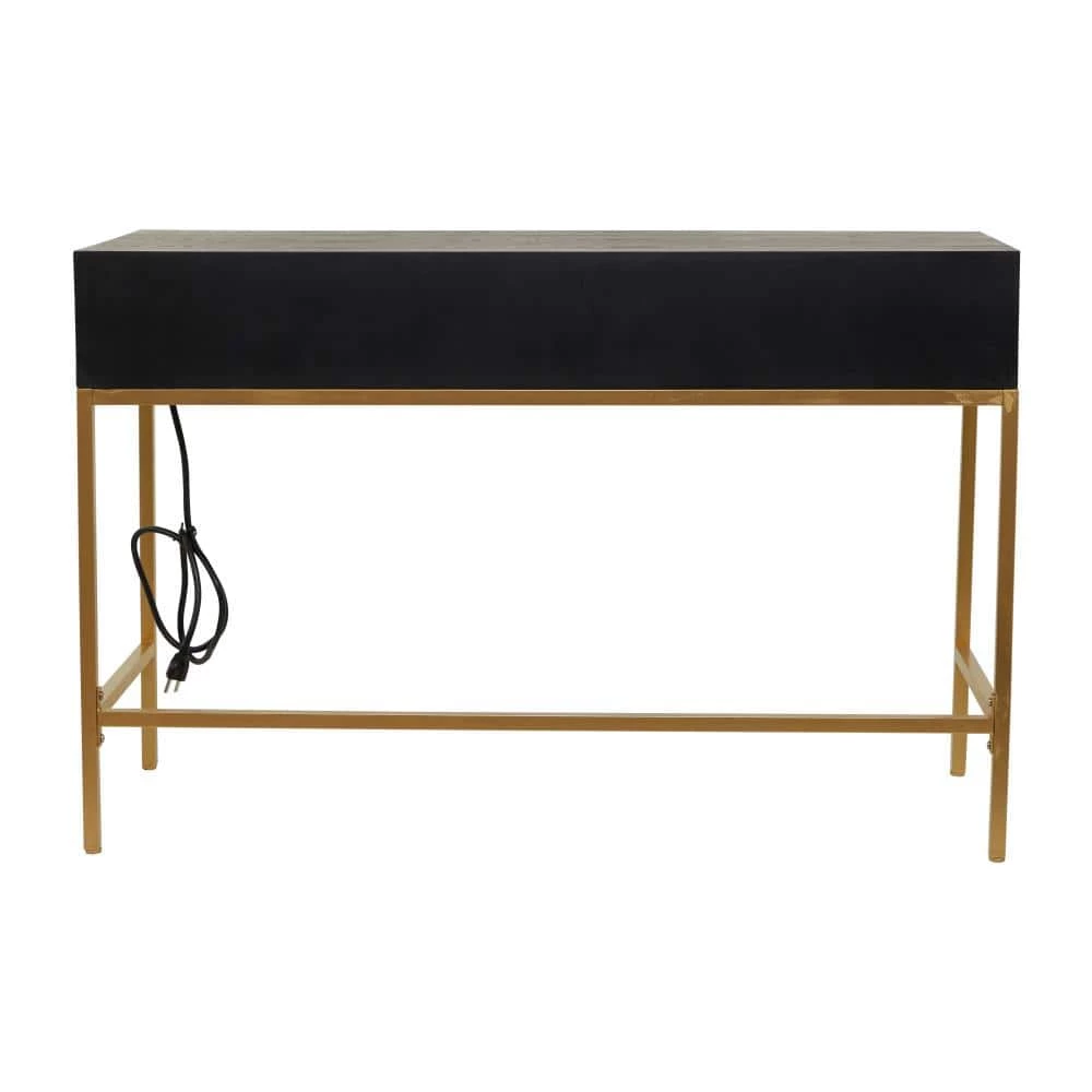 - A 3-drawer console table featuring a black wooden structure with glamorous mirror panels with gold borders and accents along with gold bar handles, gold metal base with feet stoppers, and a functional electrical outlet