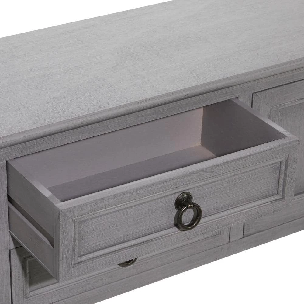 - Gray wood console table features a combination of spacious cabinets, drawers and a narrow bottom shelf for all your organizational needs with high under clearance for easy clean