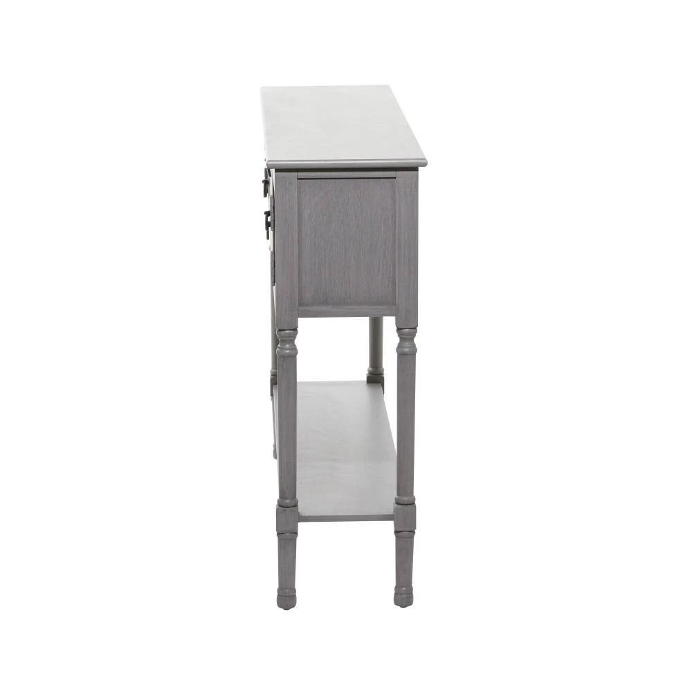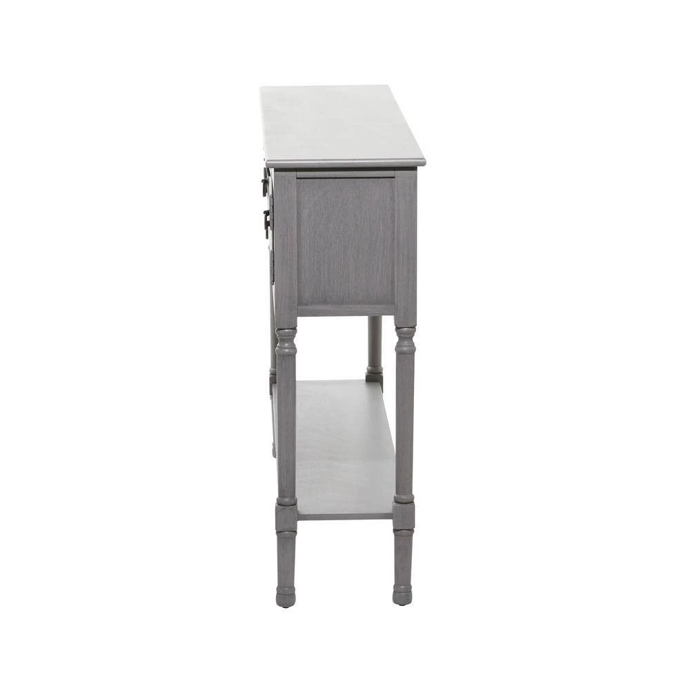 - Gray console table is crafted with a solid fir wood frame and a lower shelf unit, and features 2 drawers and 2 cabinets with metal ring handles