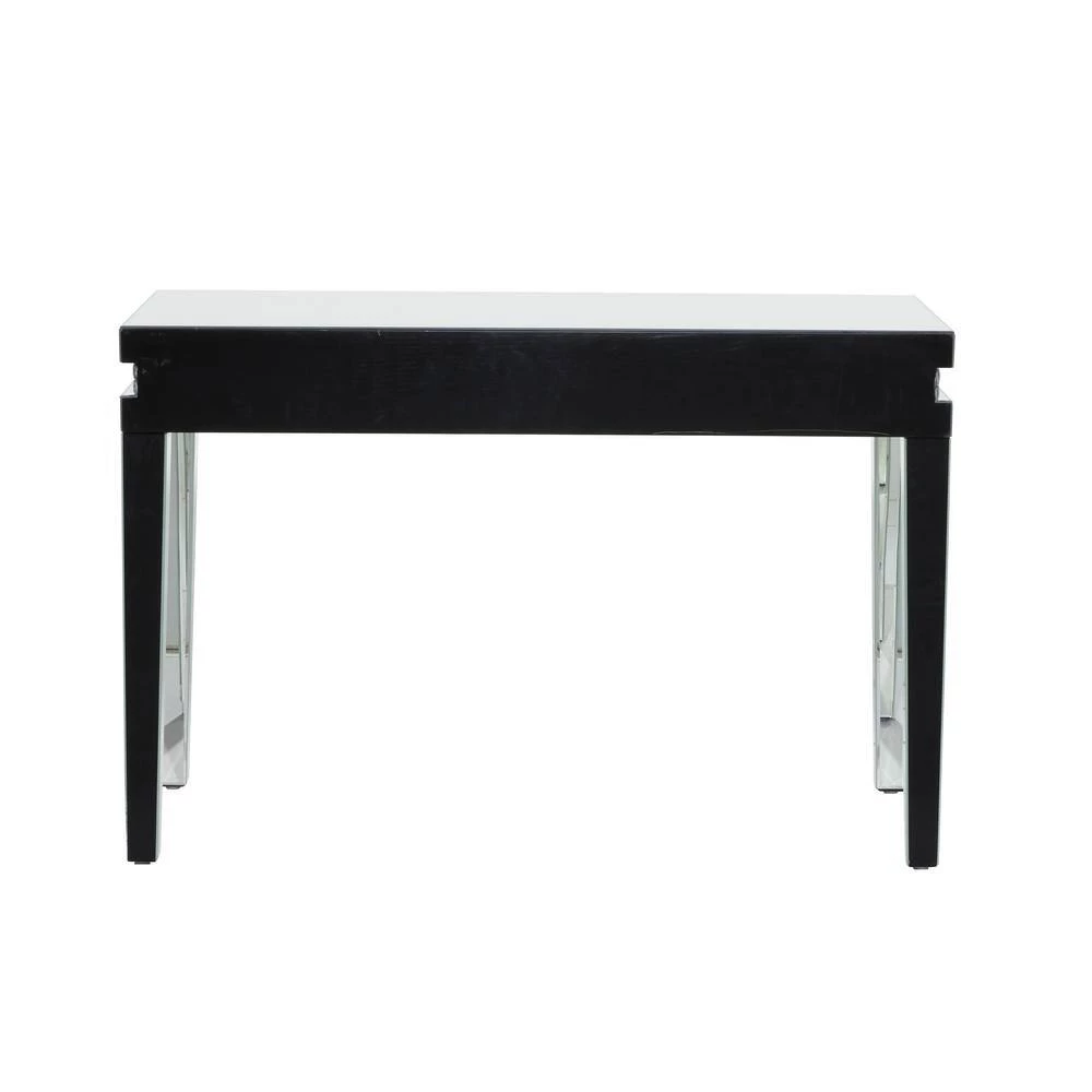 - A glam-inspired console table crafted of solid and polished wood and glass materials