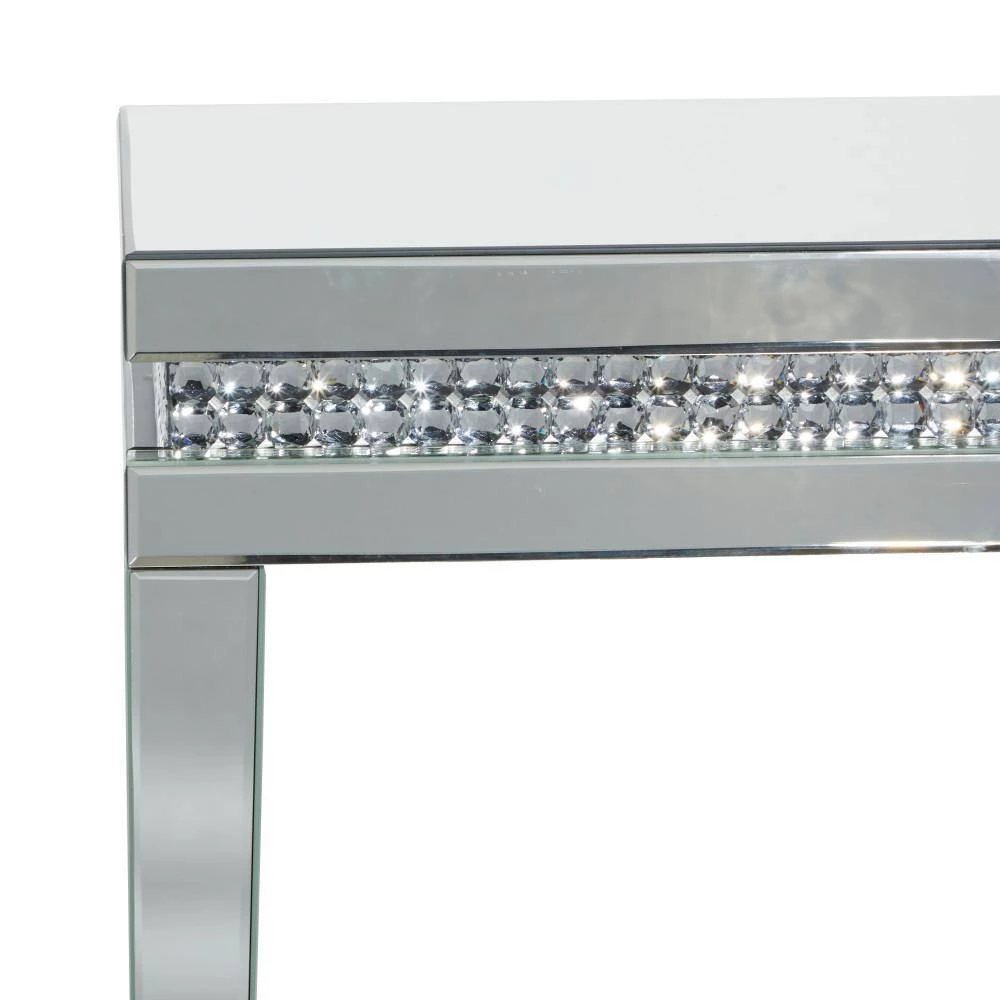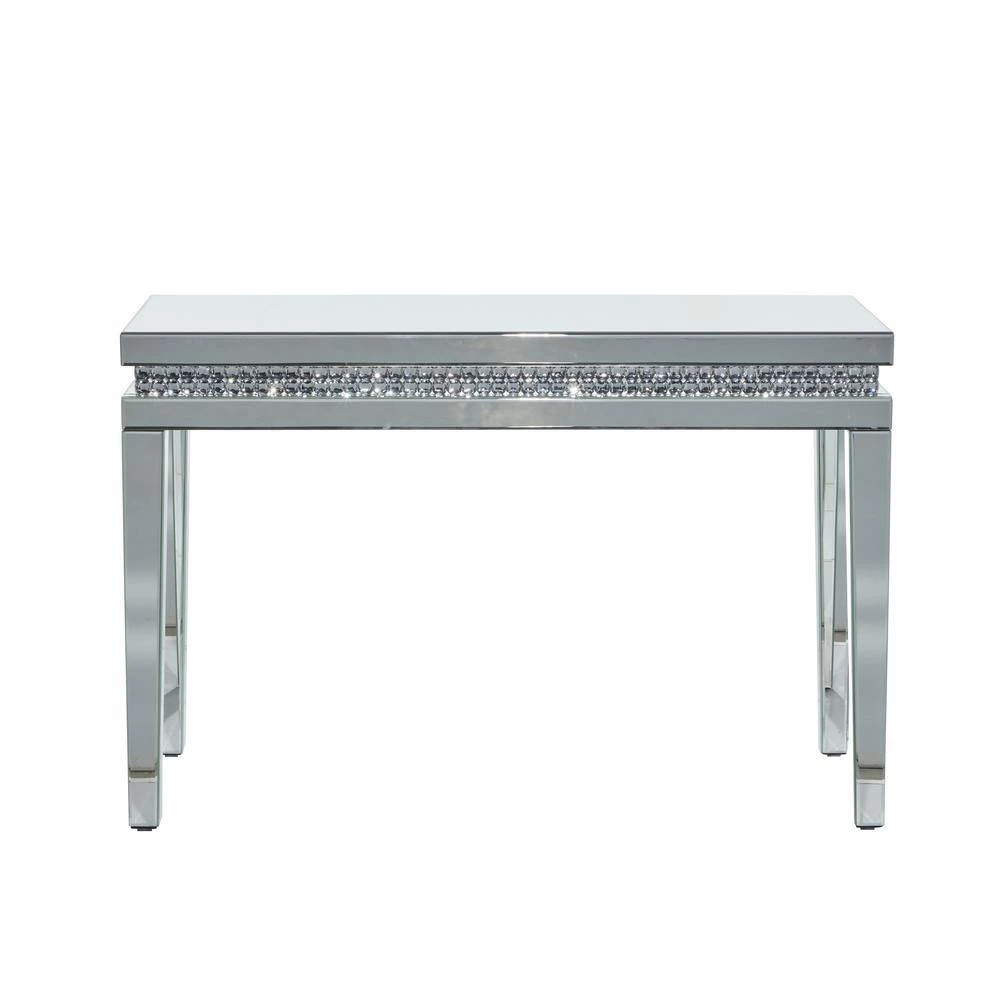- Rectangle console table feature a glass exterior with crystal embellishments around rim on four tapered legs