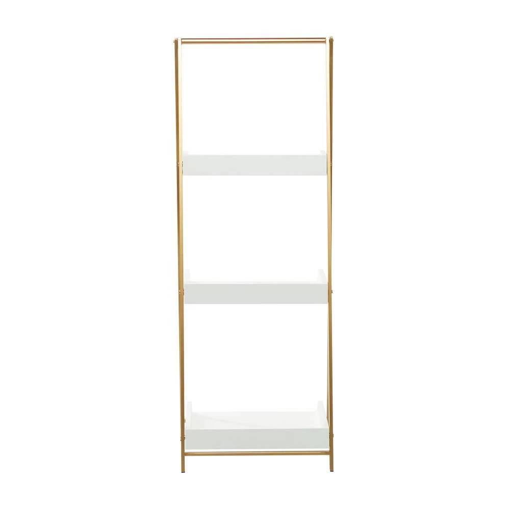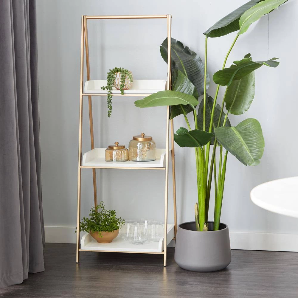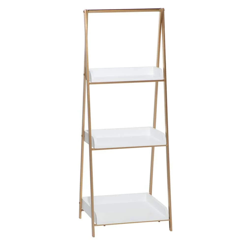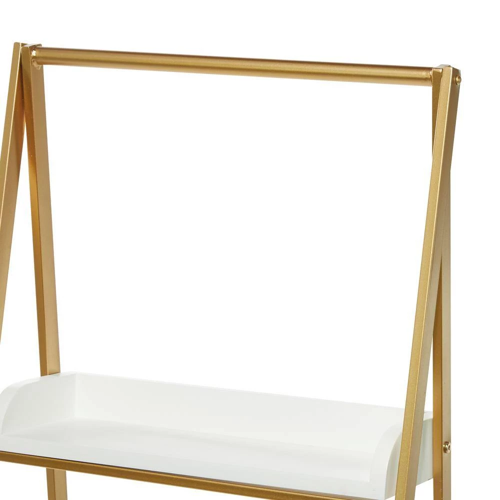 - This ladder shelf highlights daisy white shelves finish with gold accent frame finish