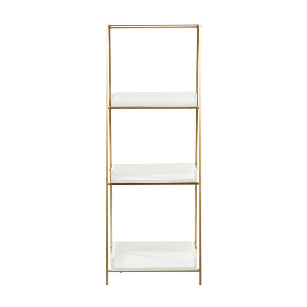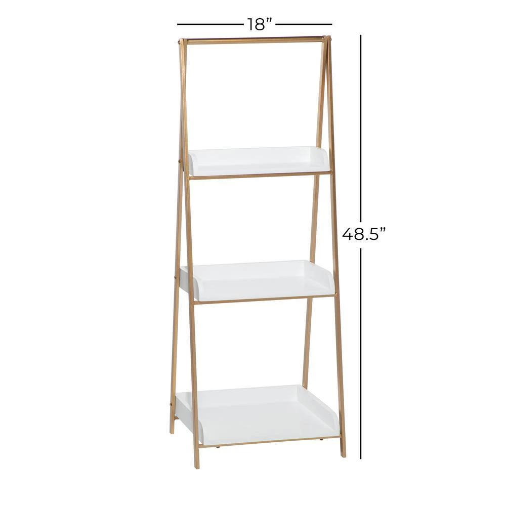 Functional and attractive with its shabby chic and modern styles, this 3-tier wood and metal shelf is certain to enhance the look and vibe of any room in your home. This oversized shabby chic shelf features a metallic gold frame and white tray-like shelves. This standing shelf brings easy storage and meets your space needs while providing a solid and decorative furniture. With versatility running in its materials, this shelf is perfect for accent Decor, indoor plants, framed memories, or kitchen items. This item comes shipped in one carton. Suitable for indoor use only. Holds up to 20 lbs. Glam inspired. This item comes with mounting hardware to prevent tipping.