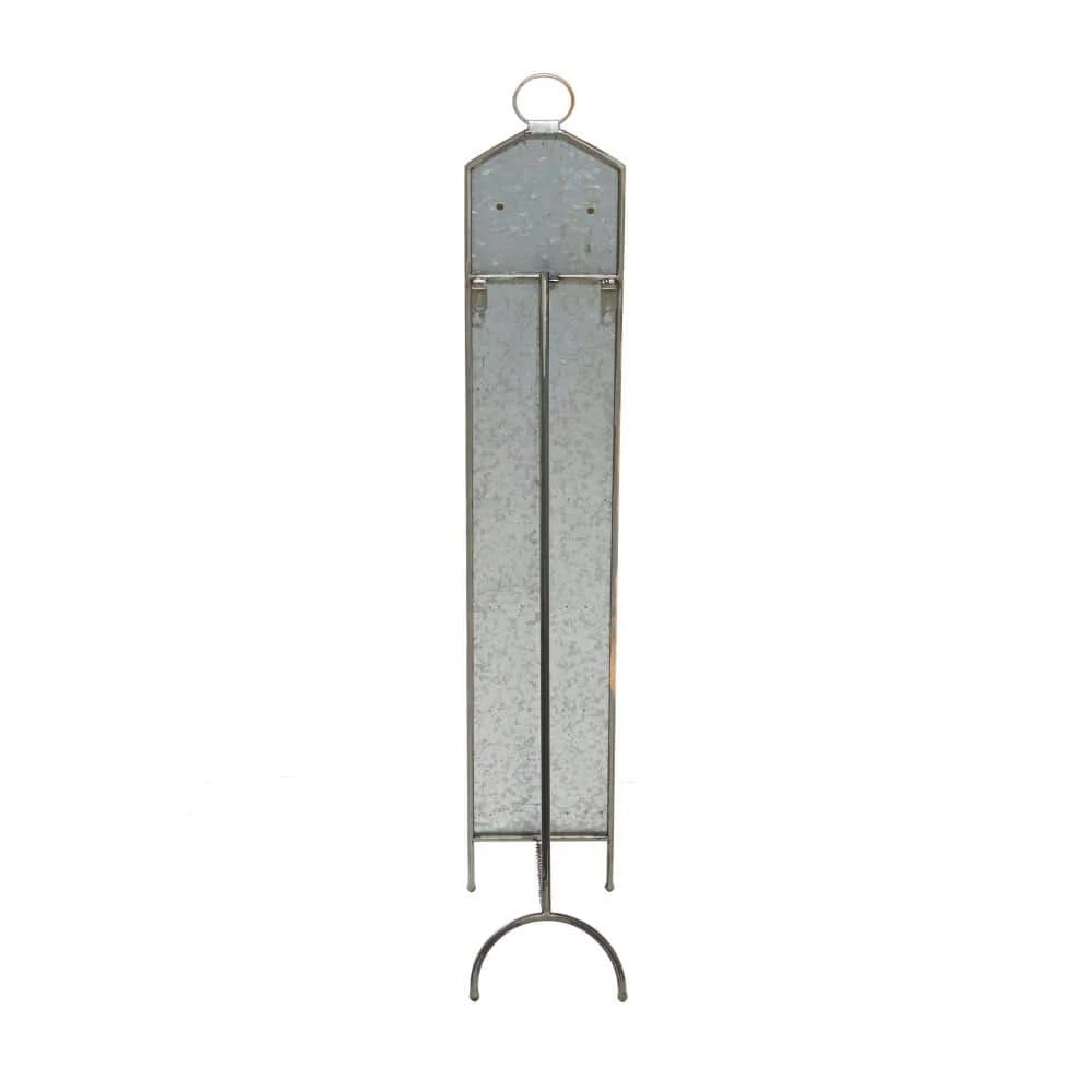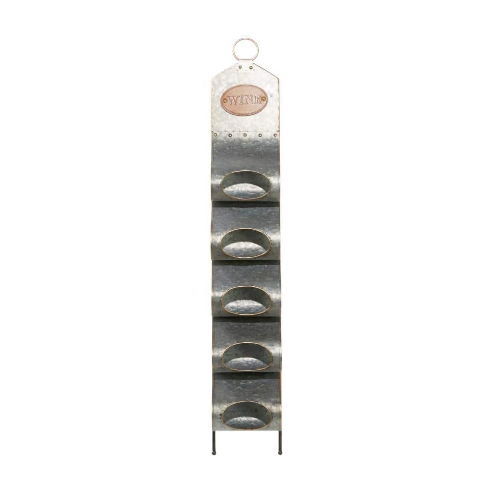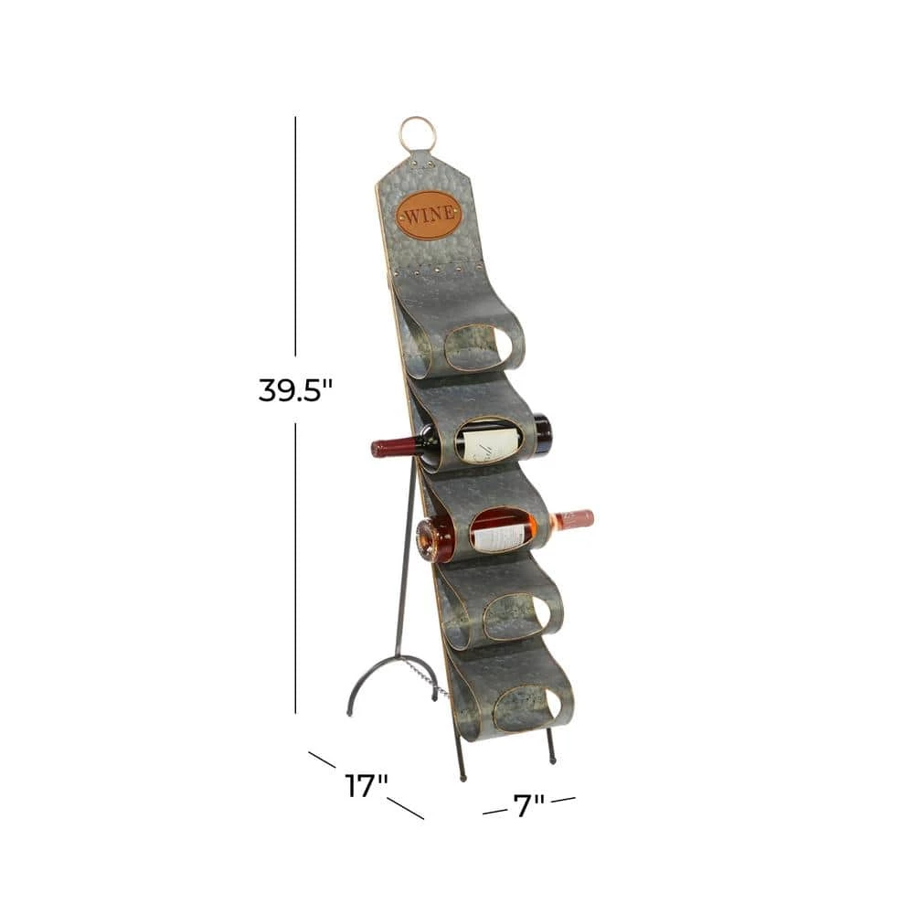 Display your wine bottles with this grey farmhouse 5-bottle metal wine holder with floor stand. Made with galvanized metal, this wine bottle holder is made with 5 metal loops as bottle holders that is securely supported by metal front and back bipod floor stands. It also highlights a faux leather lettered wine label and a single metal ring handle. Placed on your dining or living room walls, this wine bottle holder is a rustic addition to your farmhouse-themed home. This item comes shipped in one carton. Suitable for indoor use only. This item can sturdily hold 5 wine bottles. The word “WINE” is stamped on the PU leather label. Contemporary design.
