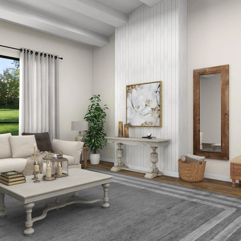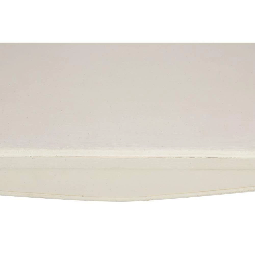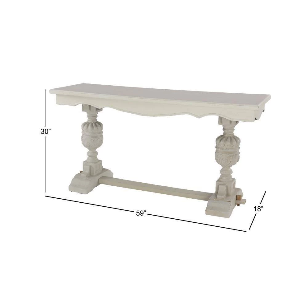 - A traditional console table carries a white finish with slight distressing for a vintage inspired look