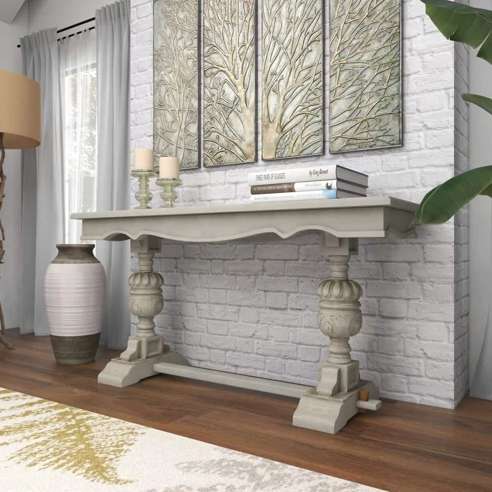 - This console table flaunts a wide rectangular top with carved lip as well as a trestle inspired base with ornate details