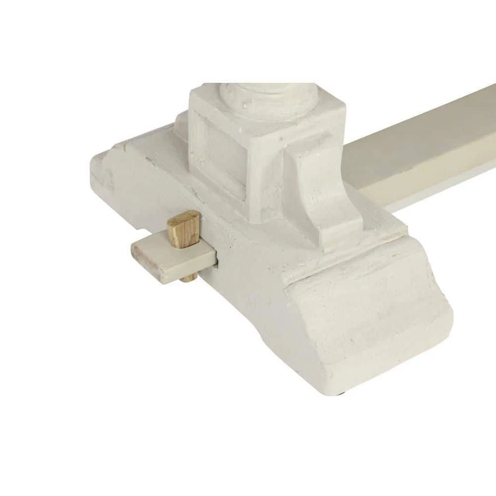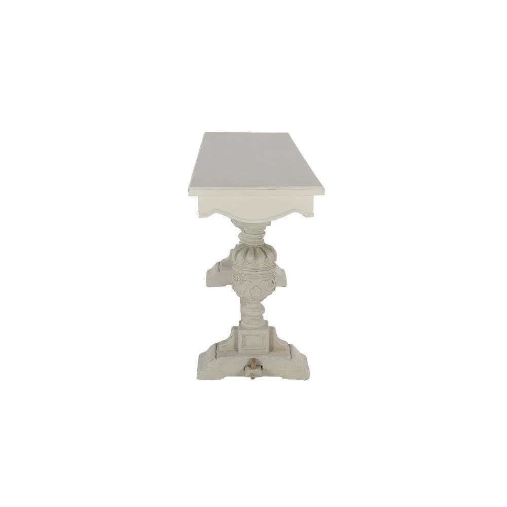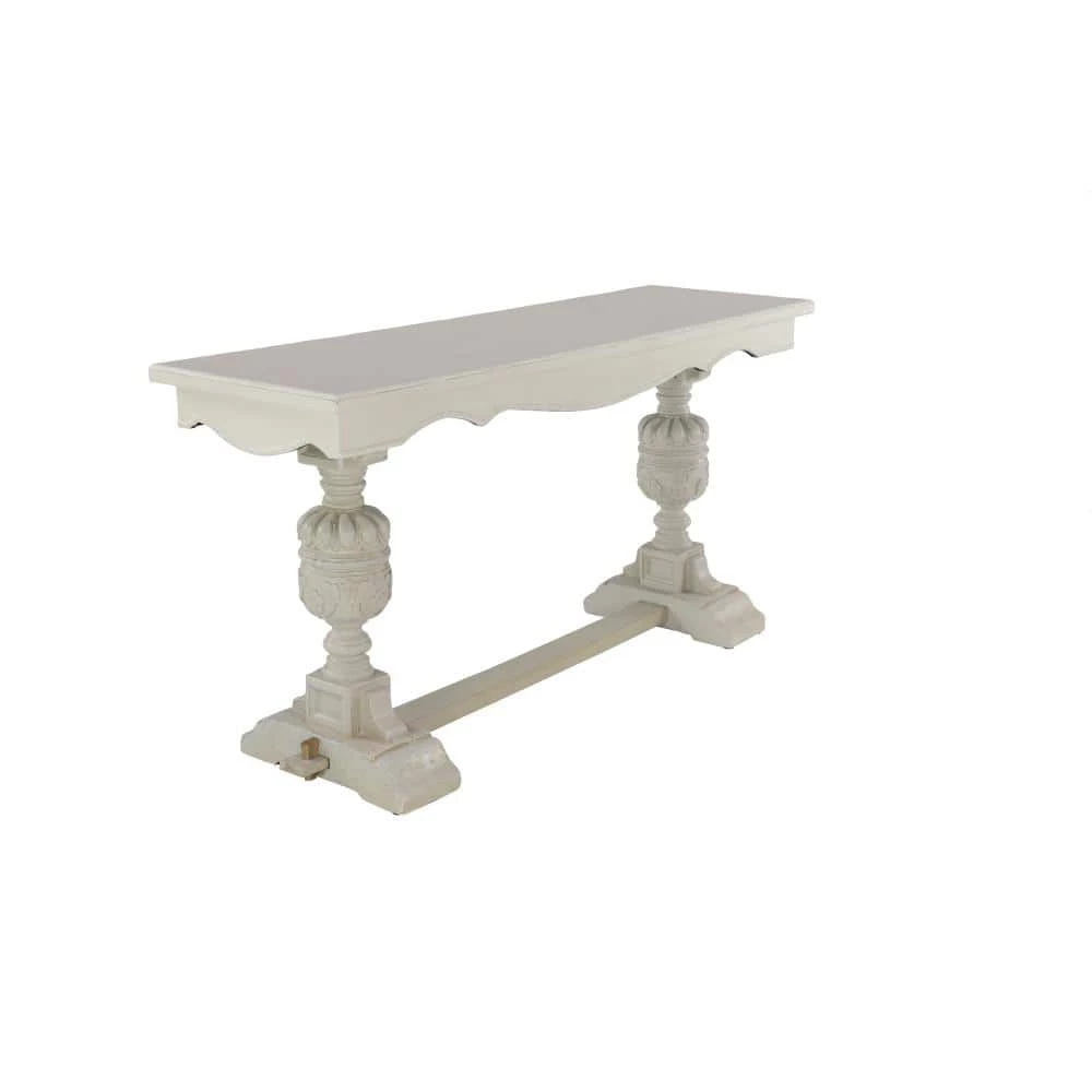 - White wood console table carries a trestle style base with intricately carved columns, narrow skirted tabletop for a delicate touch to the overall design
