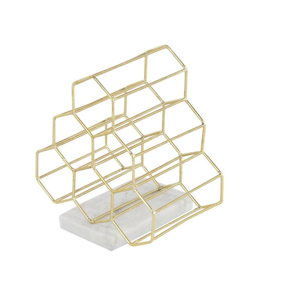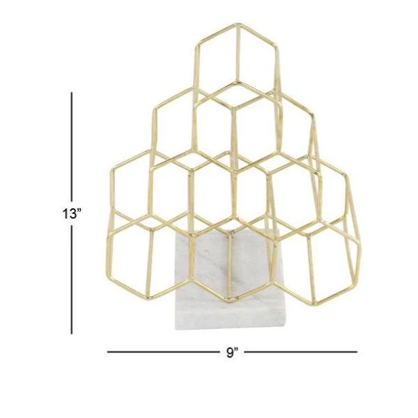 Display and organize your wine bottles with this gold finished honeycomb wine bottle rack displayed on your tables. Display your wine bottles with style and make everyone thirsty with envy. Looks stylish in your living room or kitchen as a way to display and serve your favorite wines. This item comes shipped in one carton. Suitable for indoor use only. Made in India. This wine rack can hold up to 6 standard size wine bottles. Modern design.