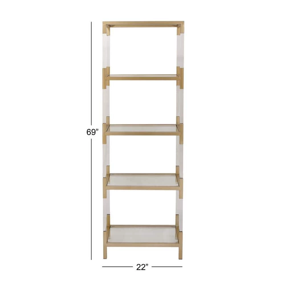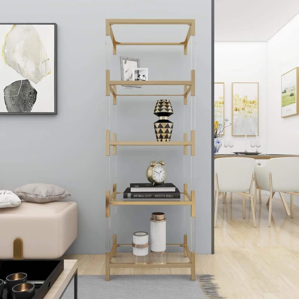 - Tall gold storage shelves is made from iron, glass and acrylic materials