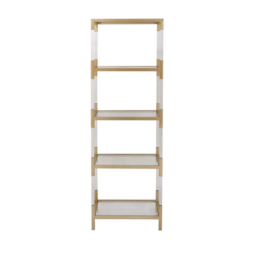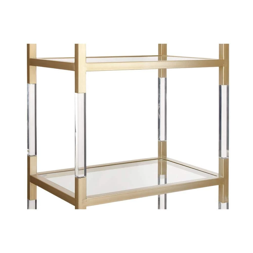 - Rectangular shelving unit carries clear acrylic leg accent and top with polished gold frames