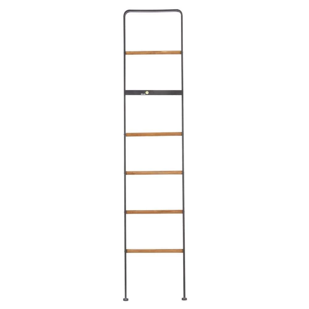 - Ladder has three hooks for hanging belongings and 5 horizontal wood rack for additional storage holder