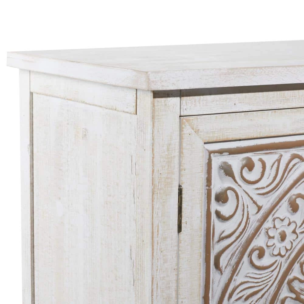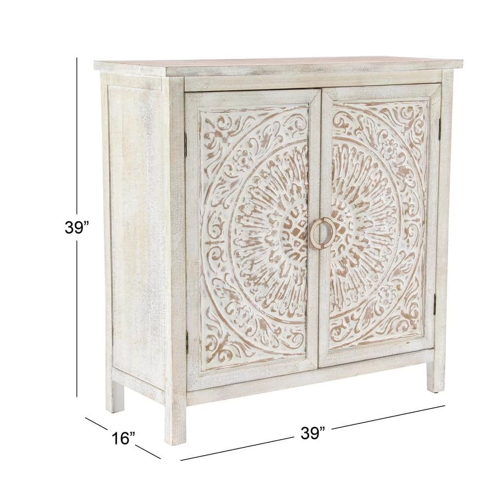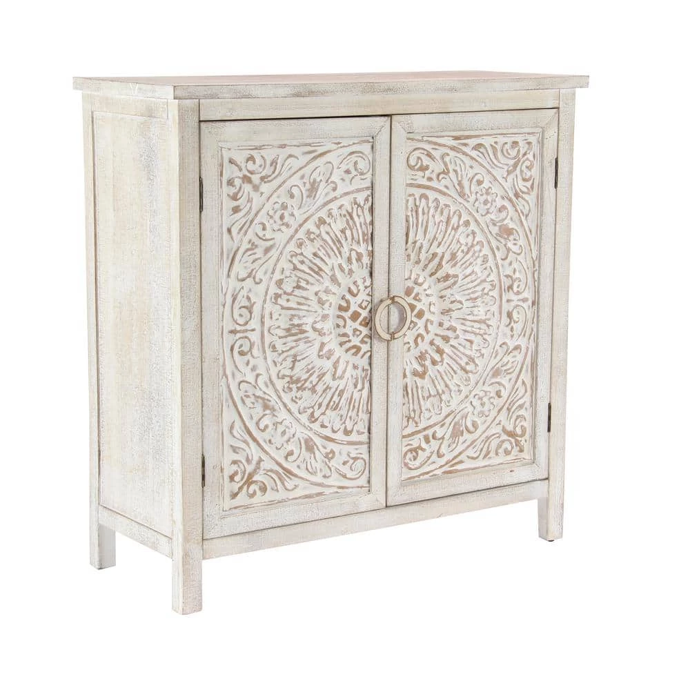 A practical yet stylish upgrade that instantly elevate the look of your room. Maintain a clutter free zone and stay organize with this chic cabinet. Add this white cabinet with doors in your living room and decorate with books and fresh cut flowers in glass vase for a delicate appeal. Designed with stoppers at the base that prevent scratching furniture and table tops, as well as sliding around. This cabinet’s interior measures 36″L x 13.4″W x 15″H. This item ships in 1 carton. Features two hinged doors with carved medallion design. Suitable for indoor use only. Maximum weight limit is 100 lbs. Farmhouse style.