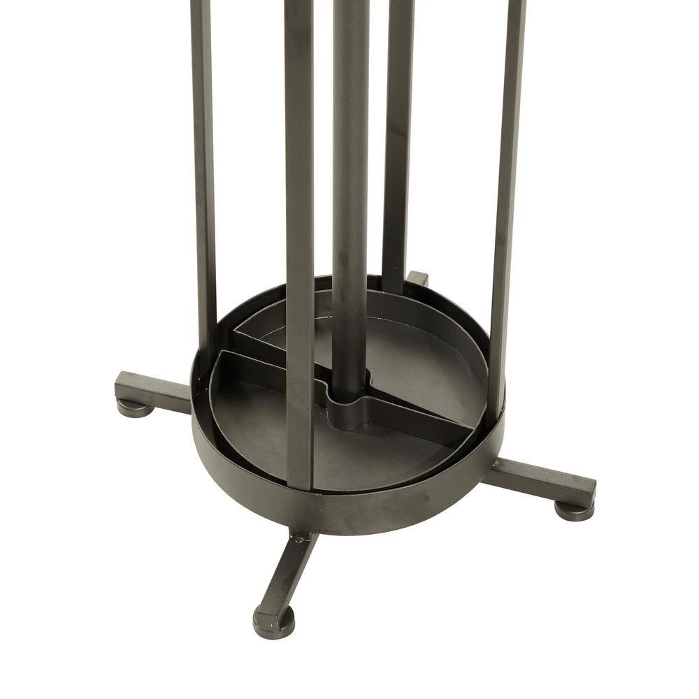 - A tall coat rack with cylindrical base and splayed feet made of long-lasting iron and fir wood