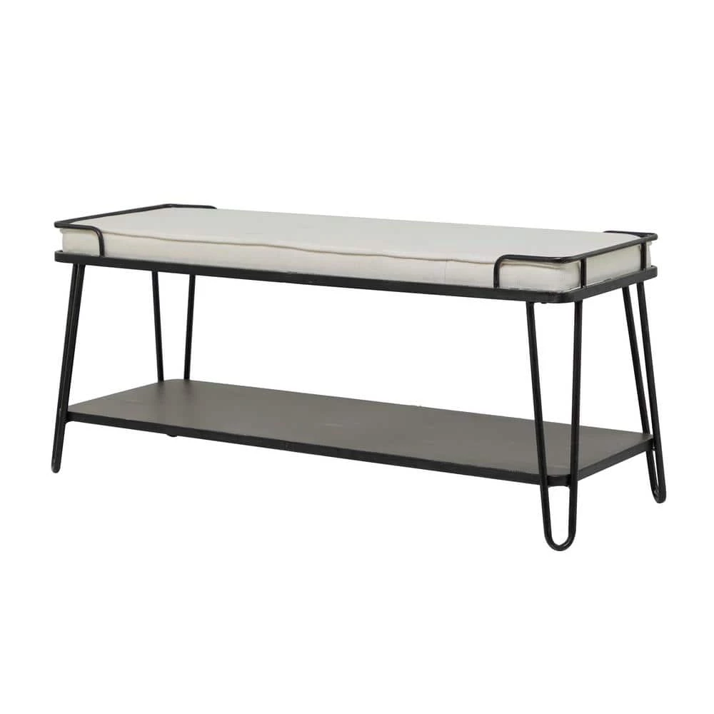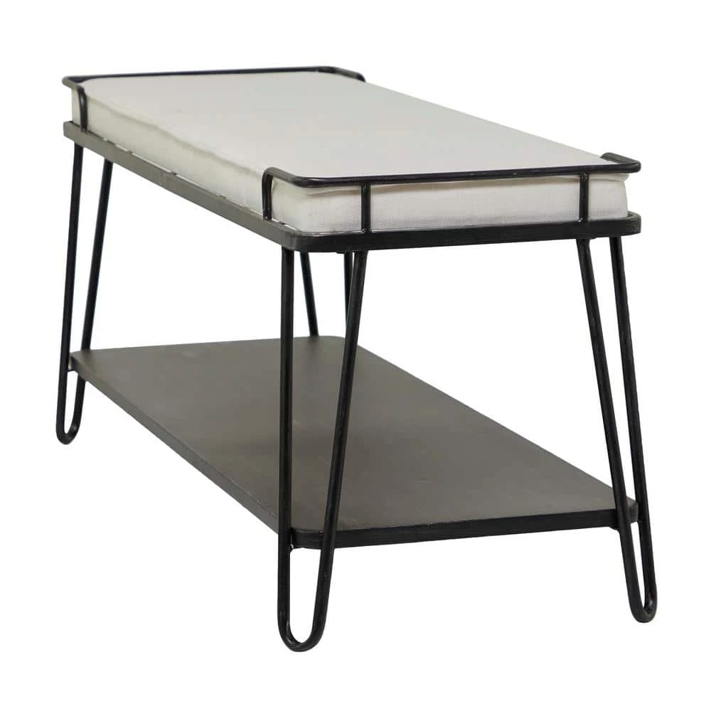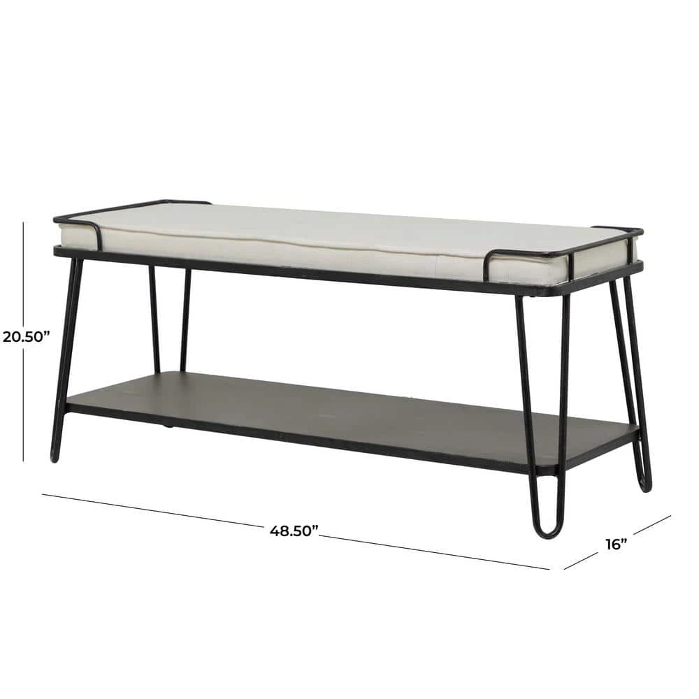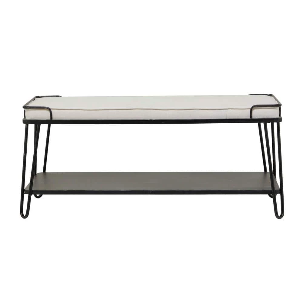 Level up your neutral toned living spaces with this large metal cushioned bench and easily store shoes, magazines, or books on its stylishly spacious lower rack. Create a balanced space in your home for a welcoming and comfortable atmosphere for you and your guests with this bench. A small piece of furniture that make a big difference to give your home an instance refresh. This item comes shipped in 1 carton. Suitable for indoor use. Industrial style. Holds up to 250 lbs. This bench can hold up to 3 people.