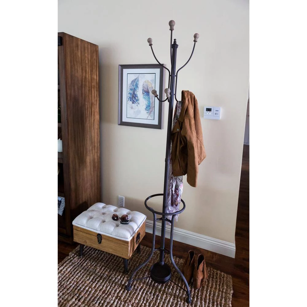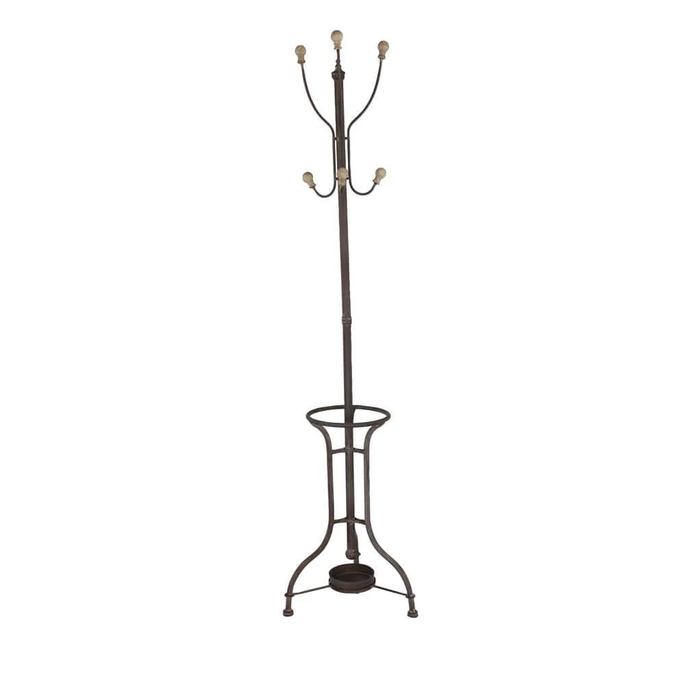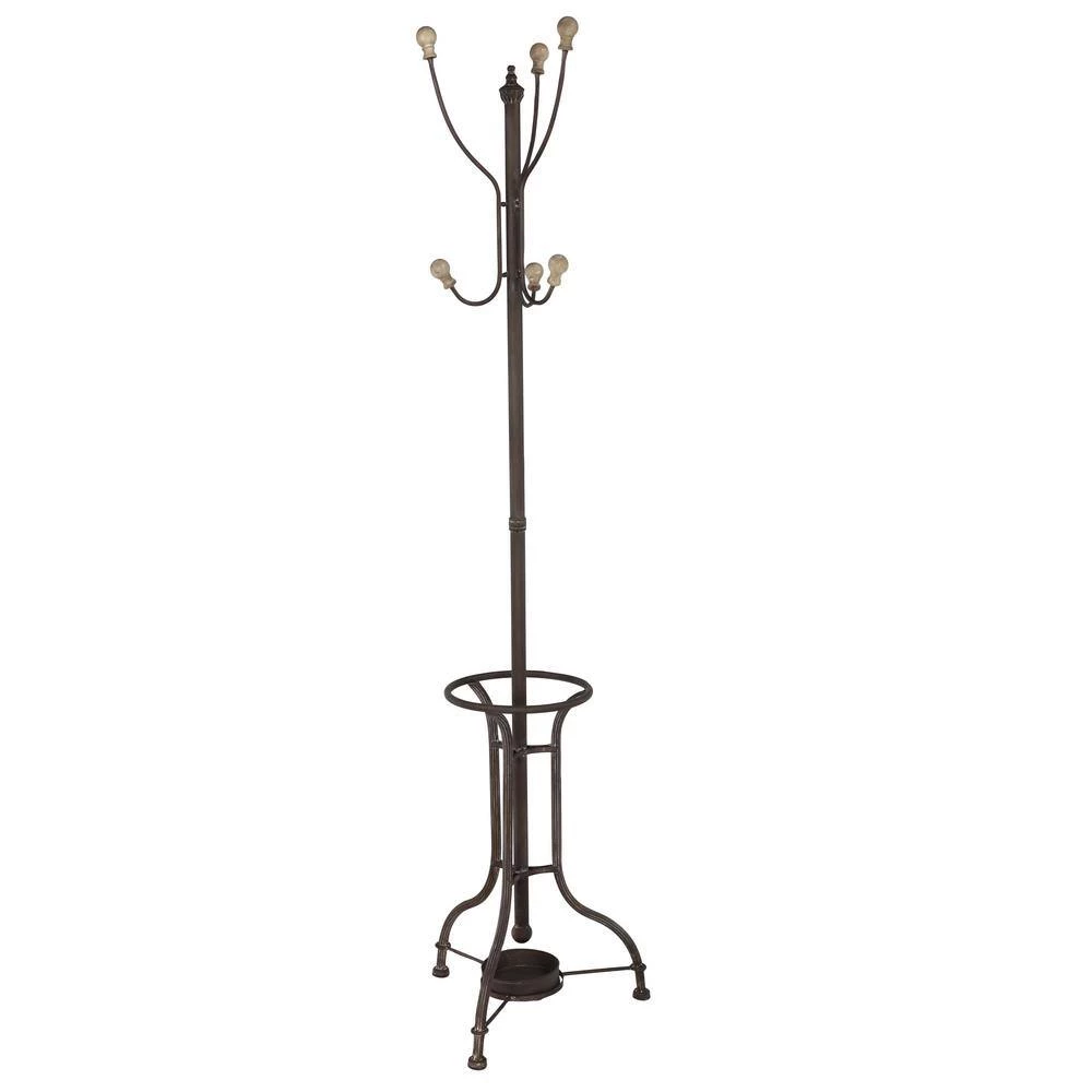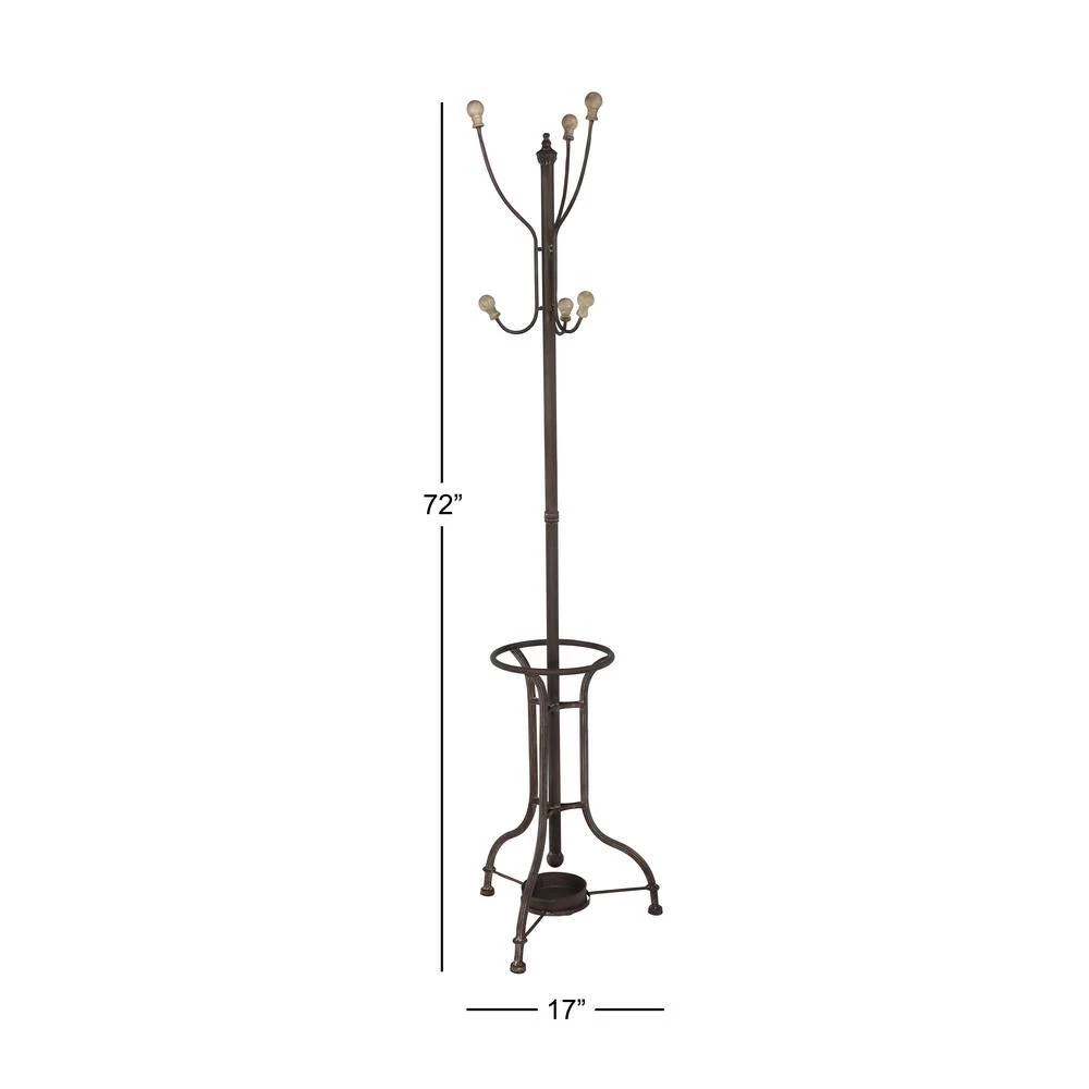 - Entryway coat rack is features hooks and an umbrella rack welded to a metal pole