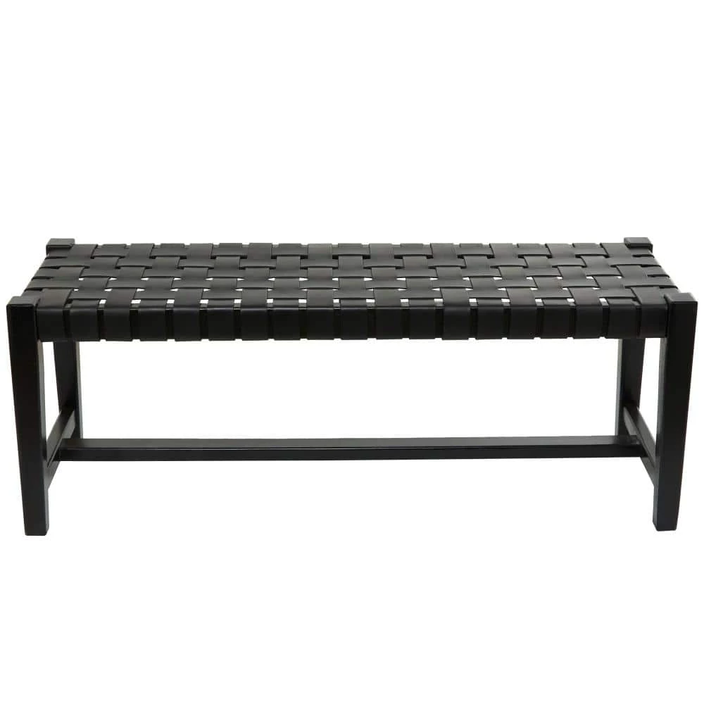 - Modern wood bench features a polished black wooden frame with black woven leather