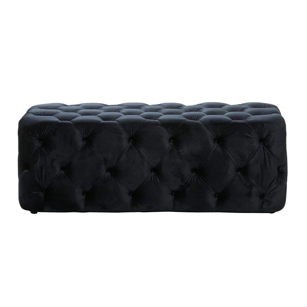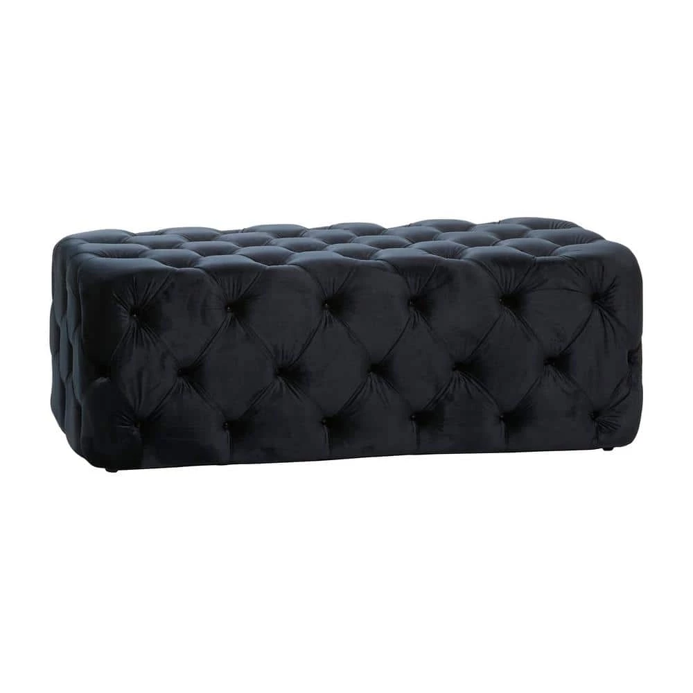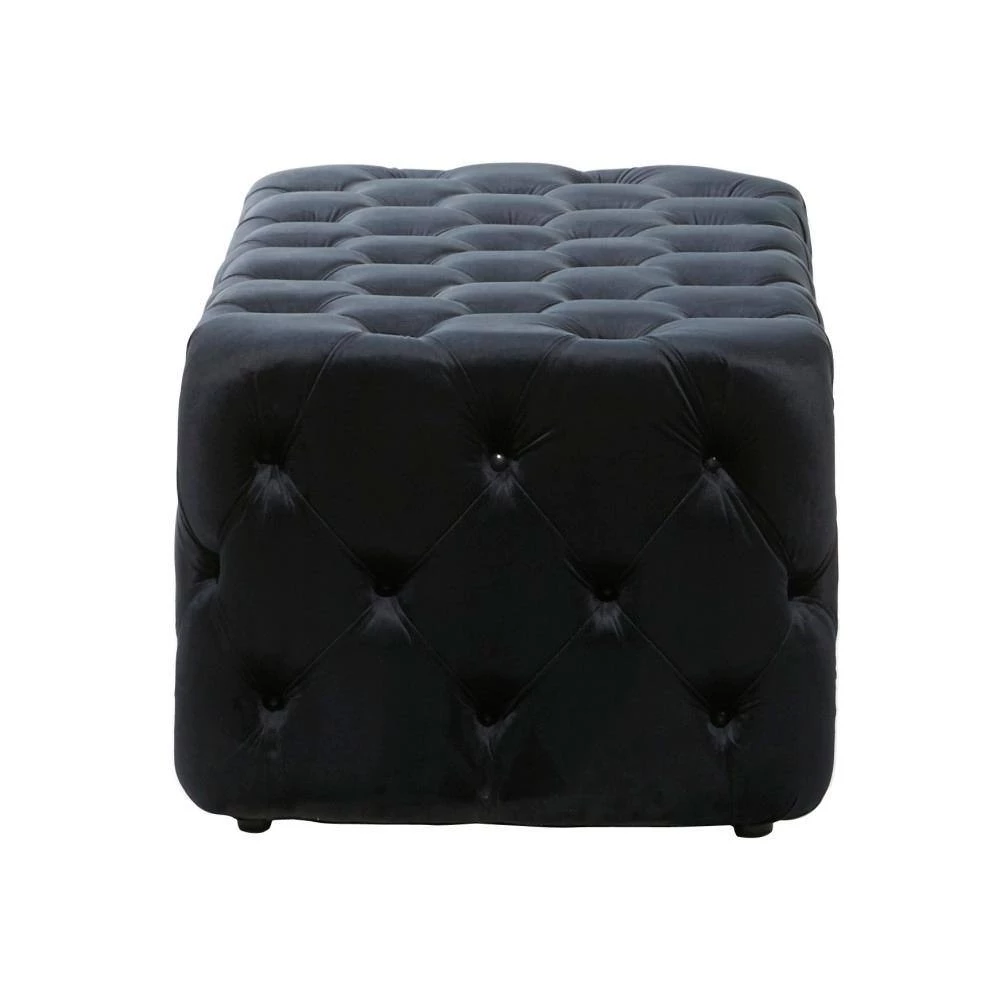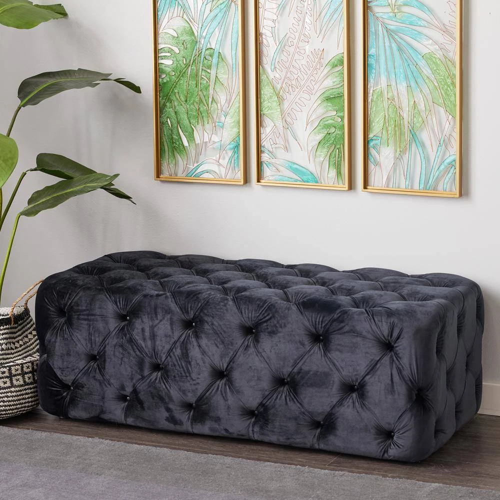 - Wooden bench is enchased in velvet fabric with deep button tufting