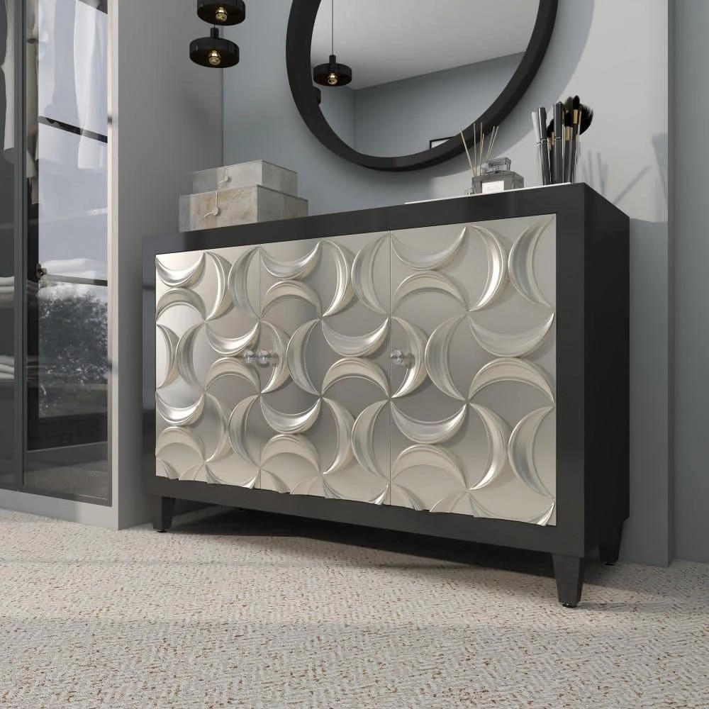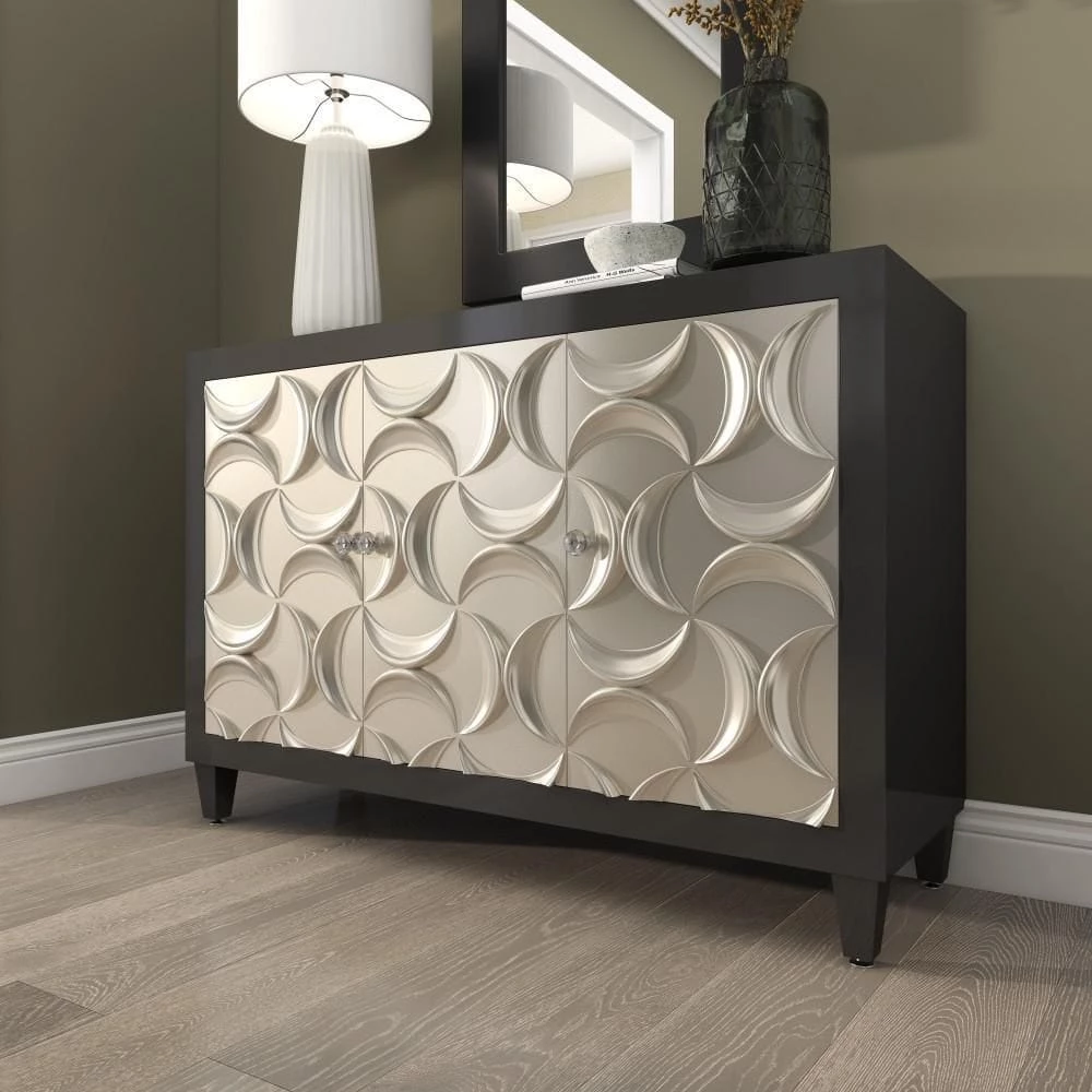 - Rectangular storage sideboard features three cabinet doors adorn with embossed crescent moon molding in an abstract formation, and complemented with crystal round knobs for an elegant touch