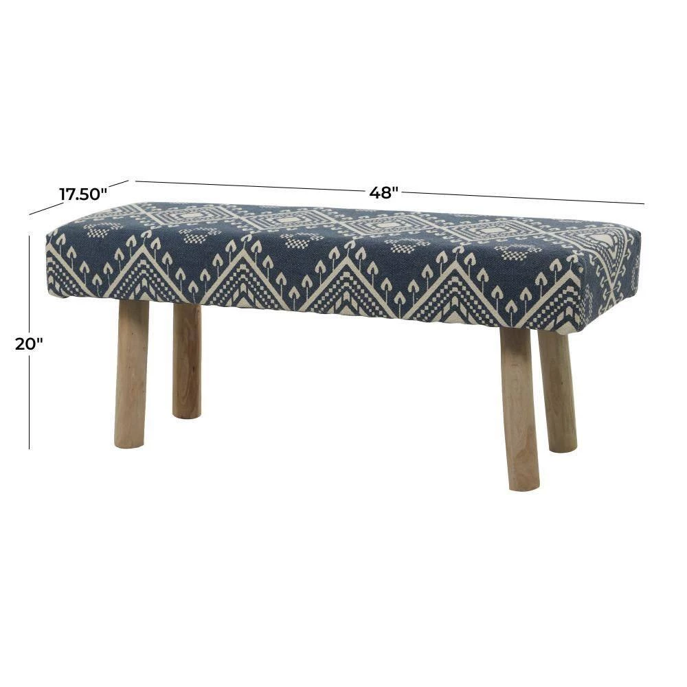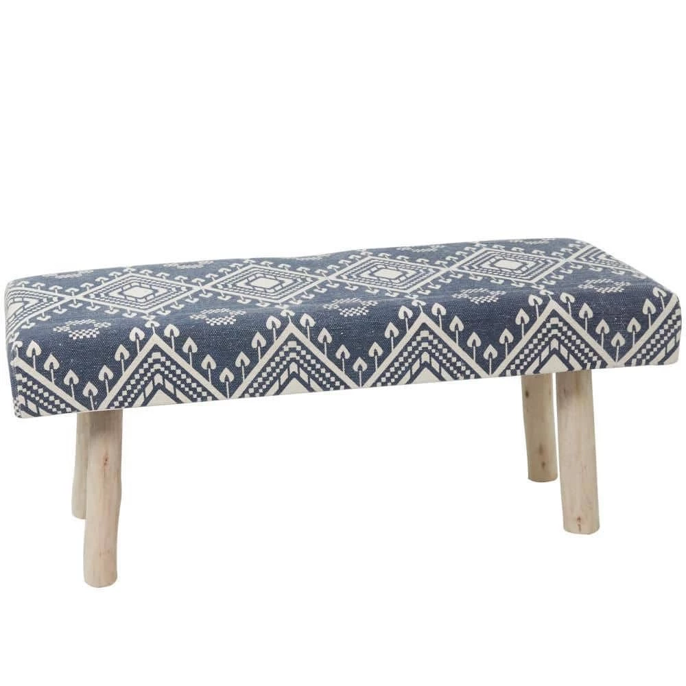 - Cushioned bench features a rectangle seat with a tribal inspired pattern