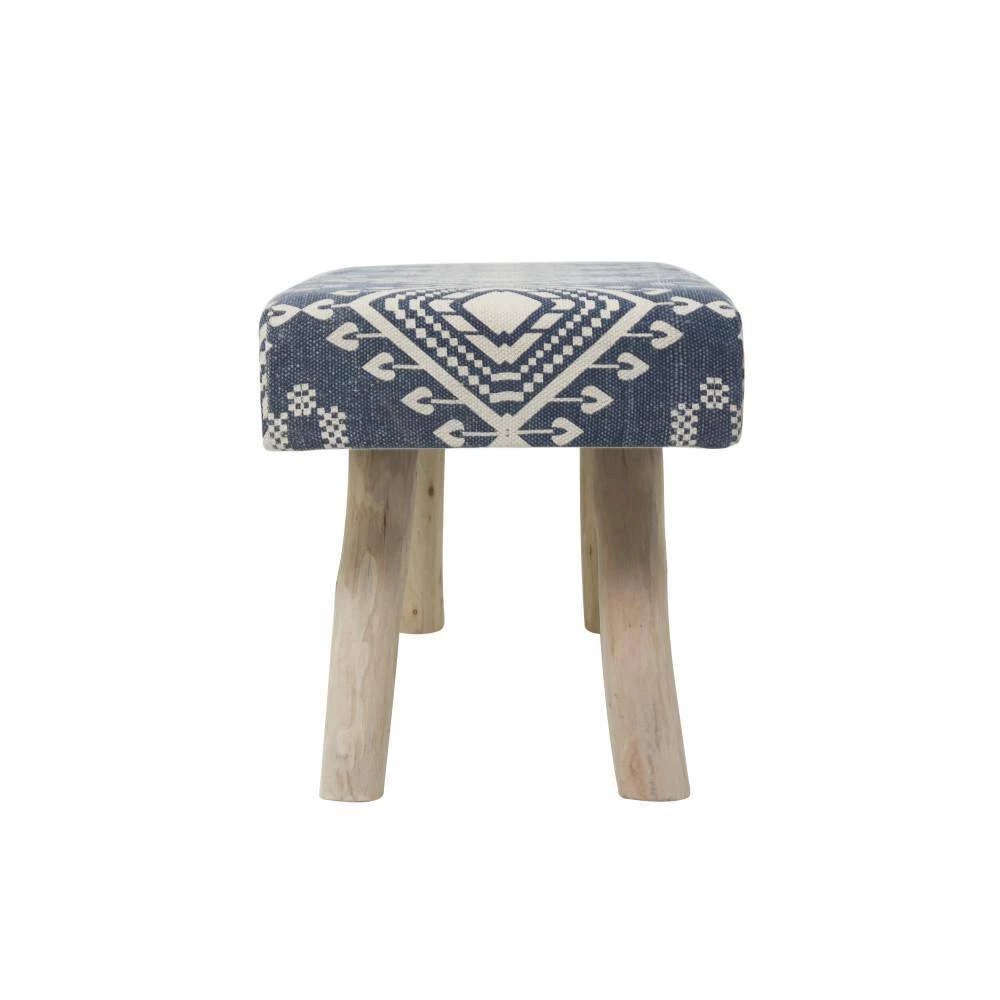 - Solid blue cushioned seat with traditional white patterns is fixed on brown wooden legs
