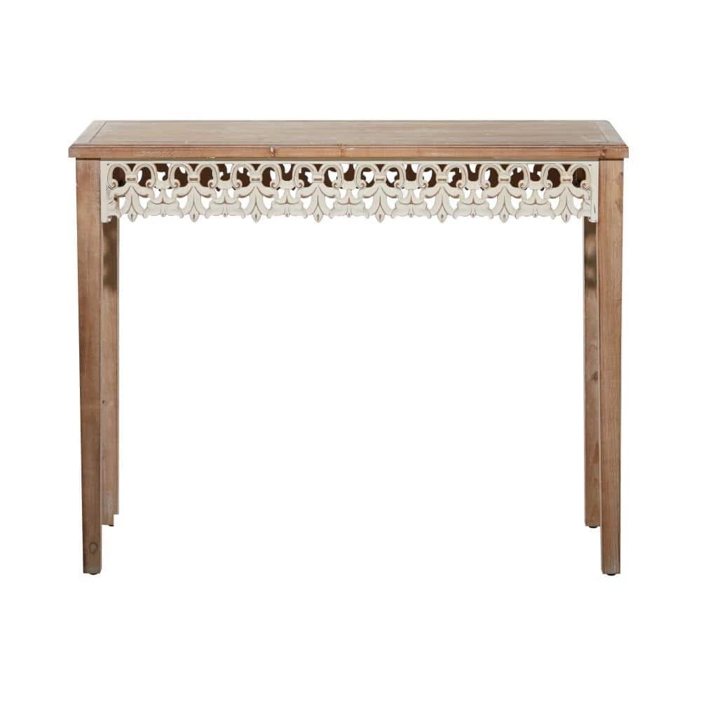 - Long console table features a whitewashed wooden finish and a distressed white scrollwork pattern design