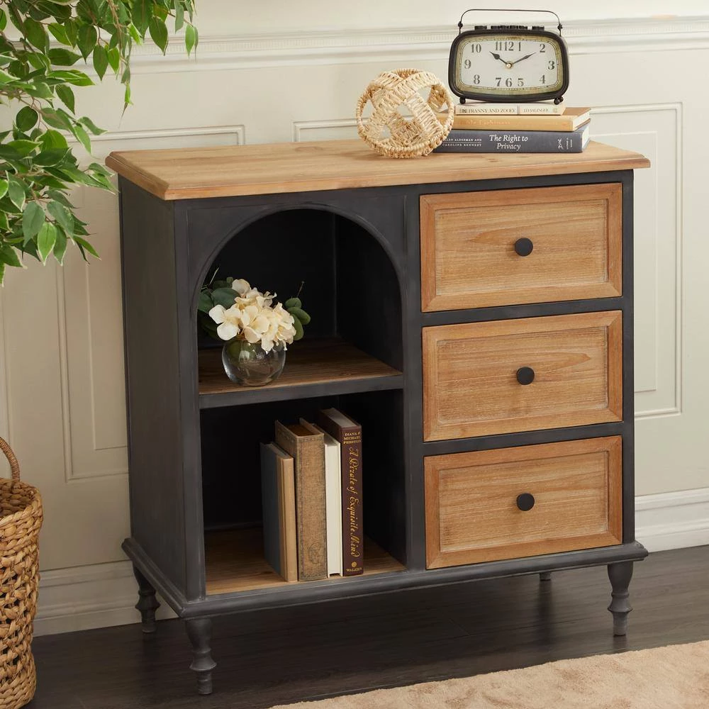 Elegant and functional, this accent cabinet easily goes with natural-toned walls and floors. A practical yet stylish upgrade that instantly elevate the look of your room. Maintain a clutter free zone and stay organize with this chic cabinet. This cabinet features 3 cabinets; each drawer can accommodate up to 25 lbs. Suitable for indoor use only. Maximum weight limit is 100 lbs., each drawer can hold up to 25 lbs. A rectangular cabinet featuring 2 shelves with weight capacity of 25 lbs. Farmhouse-themed style. This item comes with mounting hardware to prevent tipping.