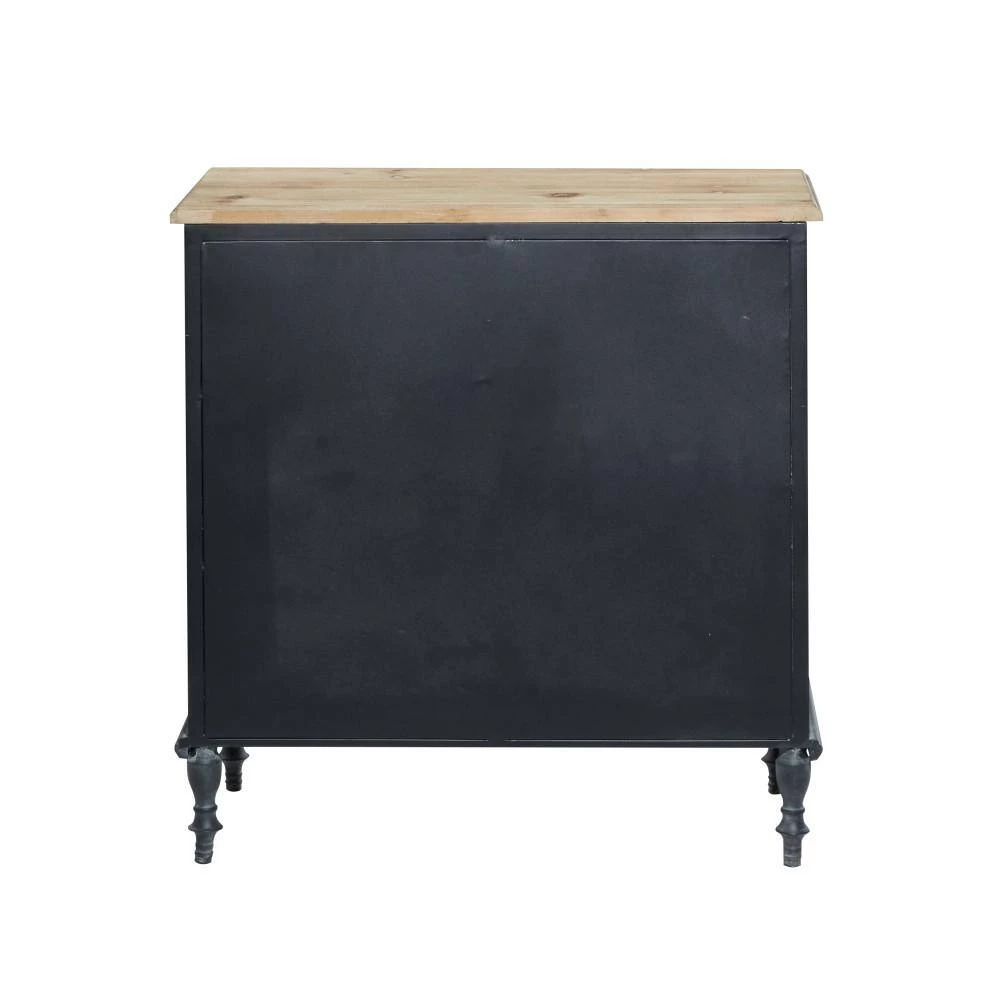 - It features a charcoal black finished metal furniture frame, drawer knobs, and pillar stands