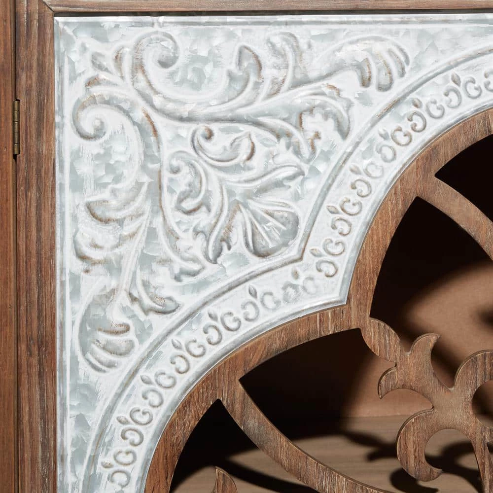- This cabinet features intricate quatrefoil open design with cut-out flowers, and it comes with metal handles and footed base